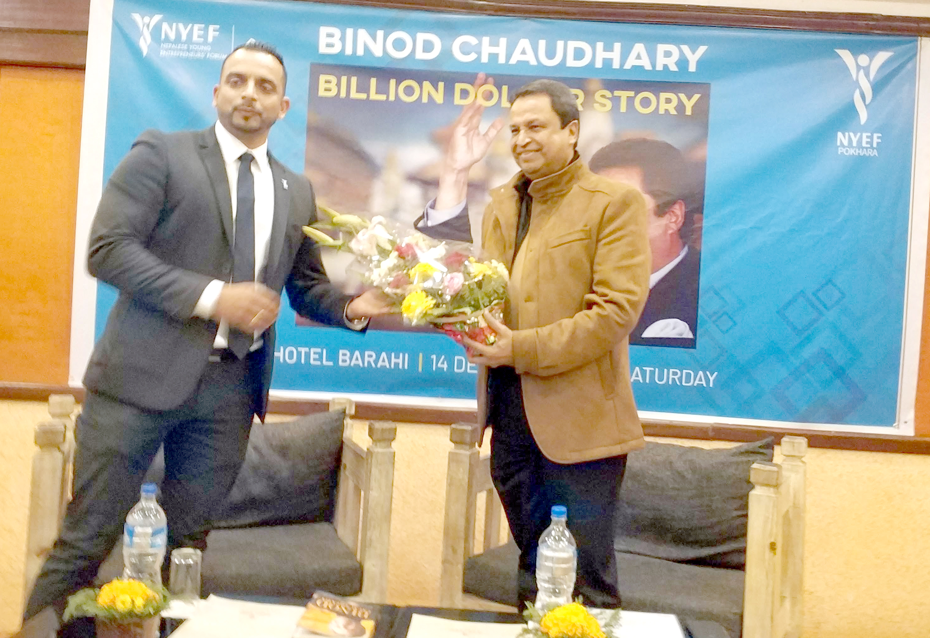 सिजी कर्प ग्लोबलका अध्यक्ष विनोद चौधरी शनिबार साँझ पोखराका युवा उद्यमीमाझ प्रस्तुत भए । नेपाली युवा उद्यमी मञ्च (एनवाइइएफ) पोखराले आयोजना गरेको ‘बिलियन डलर स्टोरी’ कार्यक्रममा उनले पोखराका युवा उद्यमीलाई लगानीका लागि अवसर सिर्जना गर्न आग्रह गरे ।