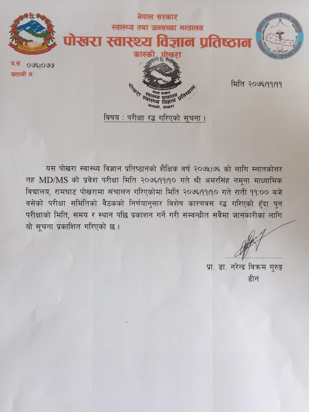 पोखरा स्वास्थ्य विज्ञान प्रतिष्ठानले पहिलोपटक सञ्चालन गर्न लागेको स्नातकोत्तर मास्टर इन डक्टरेट (एमडी) र मास्टर इन सर्जरी (एमएस) तहको प्रवेश परीक्षा नै रद्द भएको छ । शनिबार एमडी र एमएसको परीक्षा थियो ।