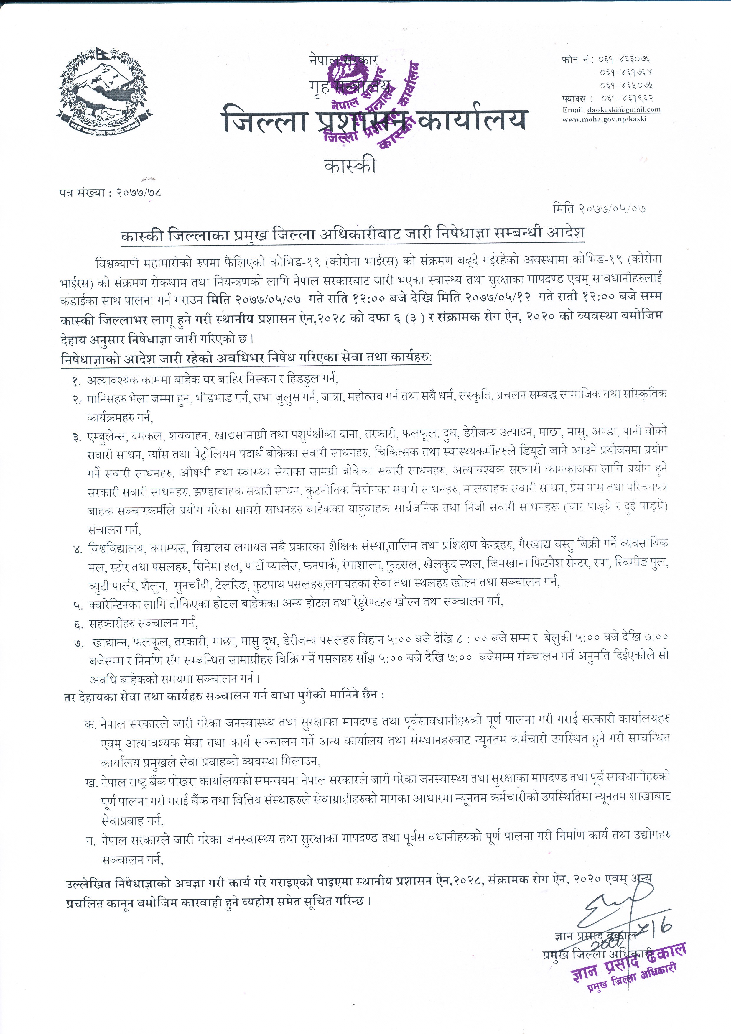 बैंक र निमार्ण सामग्री (हार्डवेयर) पसल सञ्चालन केही खुकुलो बनाएर कास्कीमा जारी निषेधाज्ञालाई निरन्तरता दिइने भएको छ ।