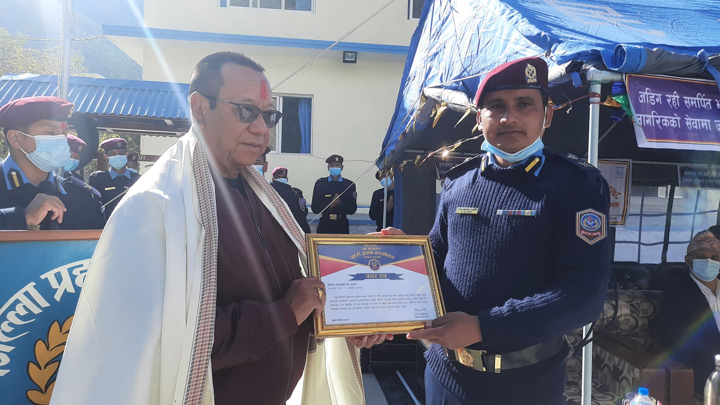 समुदाय प्रहरी साझेदारी कार्यक्रमको प्रभावकारी कार्यान्वयनमा योगदान गरे वापत प्रहरी प्रधान कार्यालय काठमान्डौंले संघका अध्यक्ष थकालीलाई सम्मान