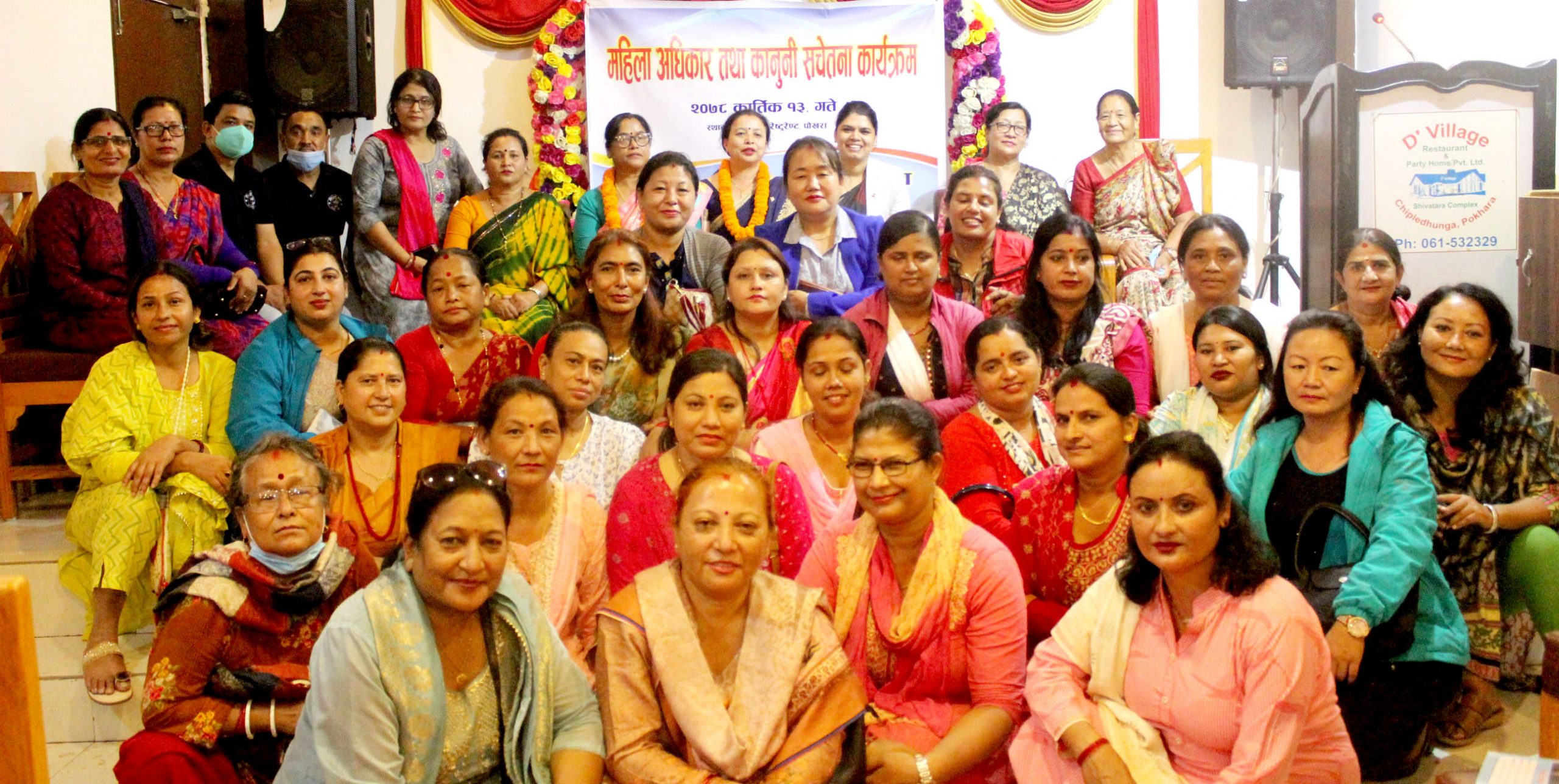 सिद्धार्थ क्लब पोखराले महिला अधिकार तथा कानुनी सचेतना आयोजना गरेको छ । कार्यक्रममा मणिपाल शिक्षण अस्पतालका स्त्रीरोग विशेषज्ञ डा जुनु श्रेष्ठले कार्यक्रमले महिला अधिकारसम्बन्धी जानकारी गराउनुका साथै कानुनले व्यवस्था गरेका अधिकार प्राप्त गर्न प्रेरित गर्ने बताइन् ।