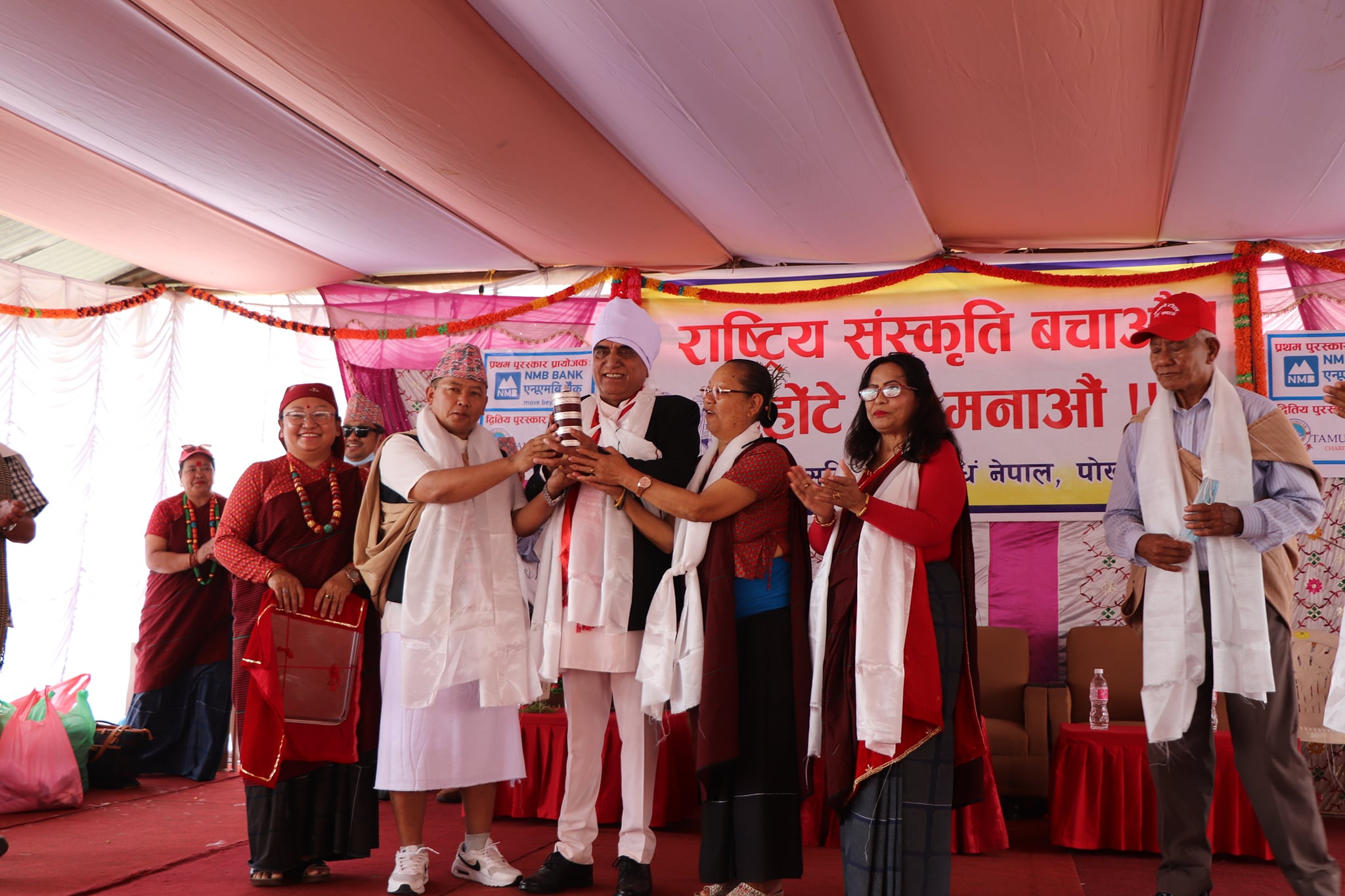 पोखरामा तमु धिं नेपालको आयोजनामा मनाइएको ट्होँटे पर्वका अवसरमा मंगलबार मुख्यमन्त्री कृष्णचन्द्र नेपालीलाई मायाको चिनो प्रदान गर्दै धिका अध्यक्ष हुम गुरुङ, पूर्वअध्यक्ष कर्म गुरुङ लगायत ।