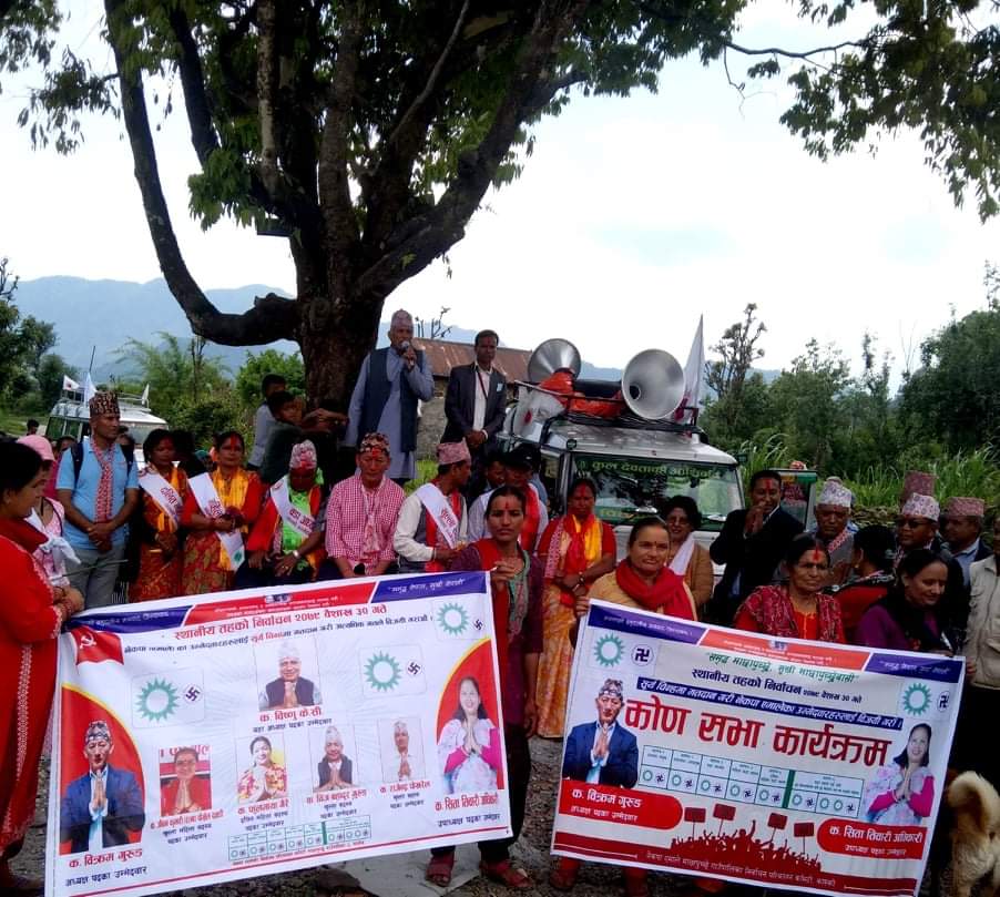 जिल्ला कमिटी सचिवालय सदस्य तथा कास्की क्षेत्र न ३ का संयोजक कर्णबहादुर गुरुङ र प्रदेश सदस्यद्वय लालबहादुर परियार र सुर्यप्रसाद लम्सालले पार्टीले लिएको निति अनुसार जनप्रतिनिधिले काम गर्ने हुनाले सुर्य चिन्नमा भोट दिन गाउँबासी मतदाताहरुलाई अनुरोध गरे ।