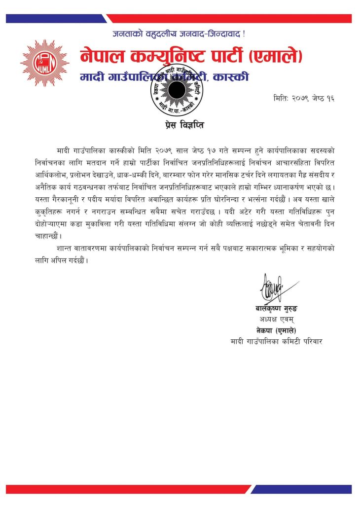 पार्टी गाउँ कमिटी अध्यक्ष बालकृष्ण गुरुङले सोमबार विज्ञप्ति निकालेर आचारसंहिता विपरीतका गतिविधिप्रति गम्भीर ध्यानाकर्षण भएको जनाएका छन् । ञकार्यपालिका सदस्यको निर्वाचनका लागि मतदान गर्ने हाम्रो पार्टीका निर्वाचित जनप्रतिनिधिलाई निर्वाचन आचारसंहिता विपरीत आर्थिक लोभ, प्रलोभन देखाउने, धाकधम्की दिने, बारम्बार फोन गरेर मानसिक टर्चर दिनेजस्ता गैरसंसदीय र अनैतिक कार्य गठबन्धनबाट निर्वाचित जनप्रतिनिधिबाट भएकोमा हाम्रो गम्भीर ध्यानाकर्षण भएको छ,झ विज्ञप्तिमा भनिएको छ ।