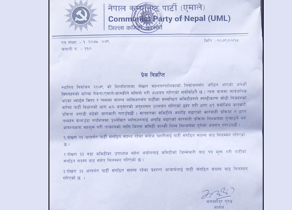 कारबाहीमा पर्नेमा पोखरा २१ का पार्टी संगठित सदस्य मनोज पहारी, पोखरा ३३ का कमिटीका उपाध्यक्ष महेश अर्याल र पोखरा ३३ पार्टी सदस्य प्रशान्त आचार्यलाई पार्टी संगठित सदस्यबाट निलम्बन गरिएको हो ।