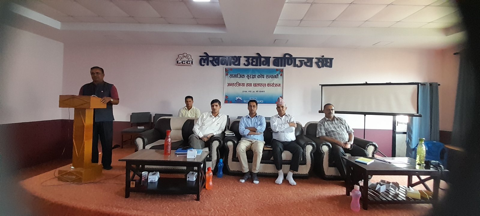 लेखनाथ क्षेत्रमा रहेका उत्पादनमूलक उद्योग, पर्यटन उद्योग, स्वास्थ्य तथा शैक्षिक संघ संस्थासँग आवद्ध सञ्चालक तथा व्यवस्थापकले बुधबार सामाजिक सुरक्षा कोषसम्बन्धी छलफल गरेका छन् । लेखनाथ उद्योग वाणिज्य संघको आयोजनामा भएको कार्यक्रममा सामाजिक सुरक्षा कोषका उपनिर्देशक एवं सहप्रवक्ता रोहित रेग्मीले कोषका नीति, नियम तथा प्रावधानबारे कार्यपत्र प्रस्तुत गरे ।