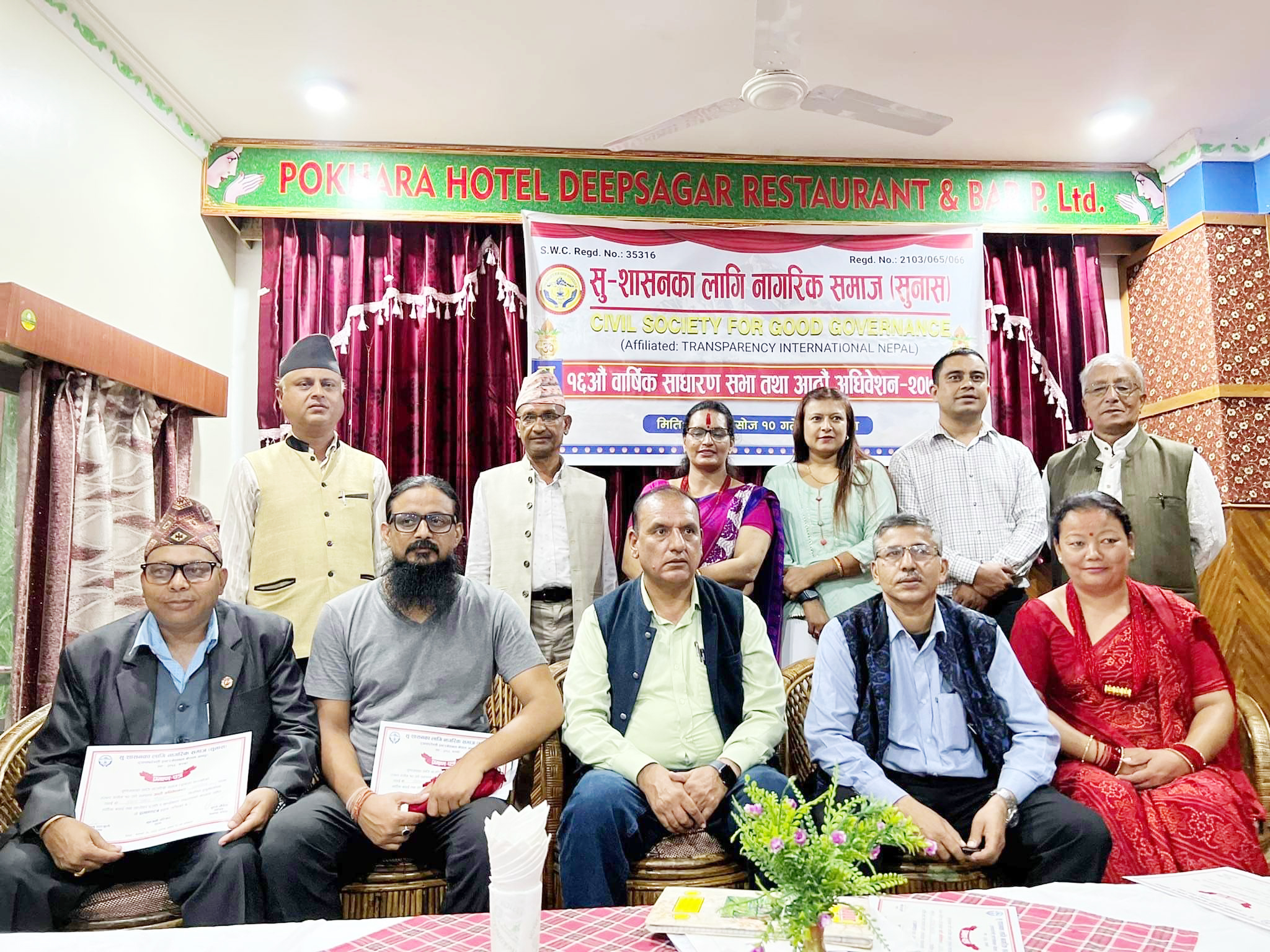 सदस्यमा लोकनाथ गौतम, शिवहरि आचार्य, ईन्दिरा भन्डारी, त्रिभुवन पौडेल, मञ्जु गौतम र चित्र सुनार चयन भएको निर्वाचन समिति संयोजक पुण्य पौडेलले जानकारी दिए । कार्यक्रममा गण्डकी प्रदेश निमित्त प्रमुख सचिव रामप्रसाद आचार्य, सल्लाहकार आनन्दराज मुल्मी, अख्तियार दुरुपयोग अनुसन्धान आयोग उपसचिव राजु कुँवर, विद्युत प्राधिकरण प्रमुख ऋषिकुमार बरनवाल, प्रदेश प्रहरी उपरीक्षक खड्ग खत्री लगायतले सुशासन प्रवद्र्धनमा सुनासले महत्वपूर्ण भूमिका निर्वाह गर्दै आएको र अब पनि नीतिगत र प्रक्रियागत भ्रष्टाचार न्यूनीकरणमा नागरिक समाजको खबरदारी निरन्तर रहनुपर्नेमा जोड दिएका थिए ।