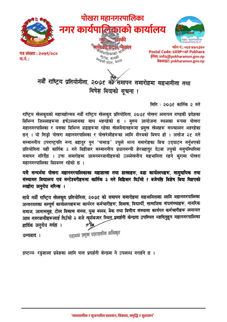 नवौँ राष्ट्रिय खेलकुद प्रतियोगिता, २०७९ को समापन समारोहमा सहभागीताका लागि आह्वान गर्दै पोखरा महानगरपालिकाले बिहीबार आधा दिन विशेष बिदा दिएको छ । राष्ट्रिय खेलकुदको महामहोत्सव पोखरा लगायत गण्डकी प्रदेशका विभिन्न जिल्लाहरूमा हर्षोल्लासका साथ सम्पन्न हुन गइरहेको भन्दै समापन समारोहमा सहभागी हुन अनुरोध सहित आफ्ना मातहतका सम्पूर्ण कार्यालय र सामुदायिक तथा संस्थागत विद्यालय एवं मन्टेश्वरीहरुमा दिउँसो १ बजेपछि बिदा दिएको हो ।
