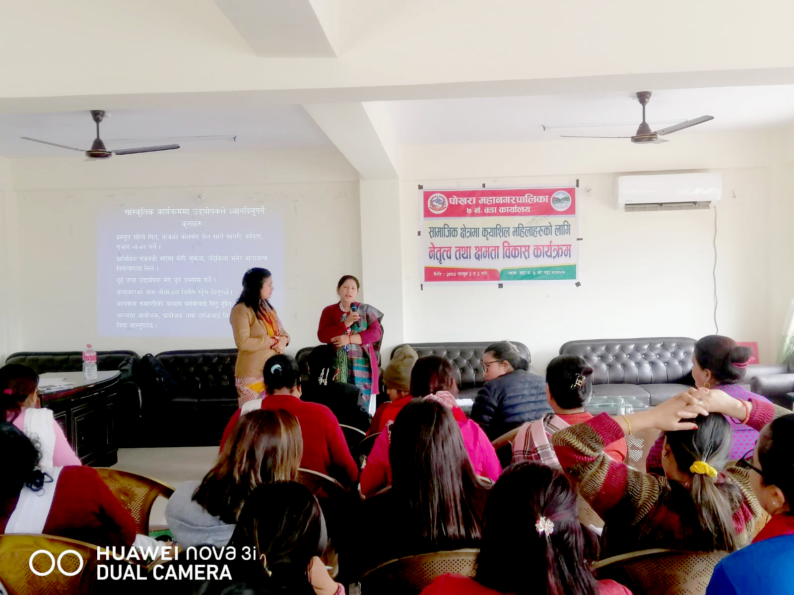 पोखरा ७ को आयोजनामा सामाजिक क्षेत्रमा क्रियाशील महिलाका लागि नेतृत्व तथा क्षमता विकास तालिम भएको छ । कार्यक्रममा पोखरा ७ का अध्यक्ष राममोहन आचार्यले सिकेका विषयलाई व्यवहारमा उतार्न आग्रह गरे । उनले तालिममा सहभागीलाई सक्रिय सहभागिता जनाउनका लागि आग्रहसमेत गरे ।