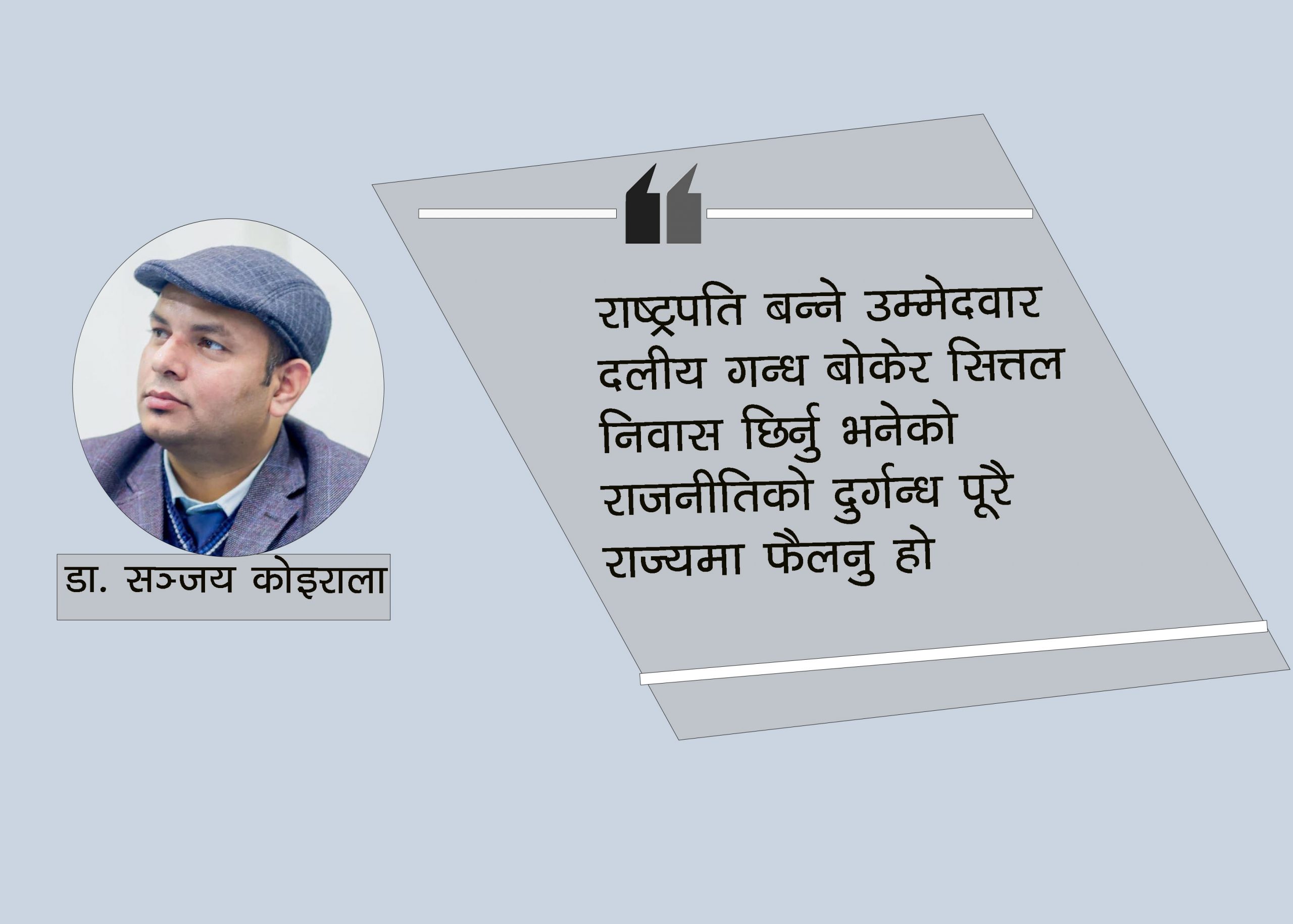 सडक नै बन्द गरेर गरिने सवारीदेखि आफ्नो पदीय दायित्व भुलेर दलीय स्वार्थको काममा राष्ट्रपति अग्रसर हुनुले जनतालाई यो संस्थाले परिकल्पना गरेको अभिभावकको पूर्ति हुन सक्ने कुरामा विश्वस्त हुने ठाउँ छैन । छिमेकी राष्ट्र भारतमा भर्खरैमात्र भएको राष्ट्रपति निर्वाचनले पूरै दुनियालाई एक सकारात्मक सन्देश दिन सफल भएको अवस्थमा नेपालमा भने सो पदका लागि भइरहेको राजनीतिले आम जनतामा आशाभन्दा बढी निराशा पैदा गरेको छ । राष्ट्रपति बन्ने उम्मेदवार दलीय गन्ध बोकेर सित्तल निवास छिर्नु भनेको राजनीतिको दुर्गन्ध पूरै राज्यमा फैलनु हो । यसले किमार्थ राज्यलाई र स्वयम् राजनीतिक दलहरुलाई पनि फाइदा गर्दैन ।