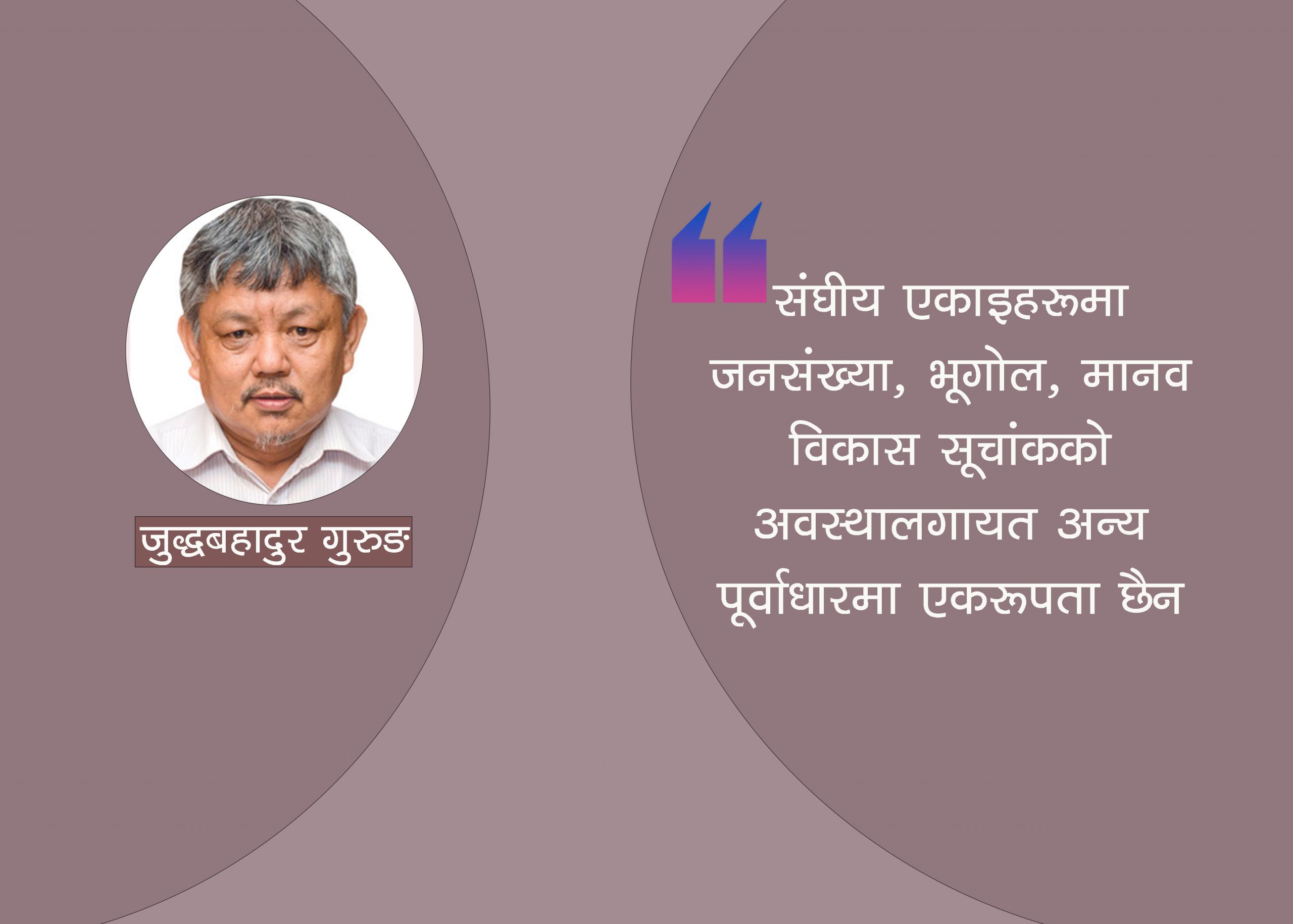 संघीय एकाइहरूमा जनसंख्या, भूगोल, मानव विकास सूचांकको अवस्थालगायत अन्य पूर्वाधारमा एकरूपता छैन ।