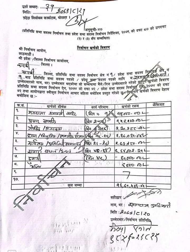गण्डकी प्रदेशका निवर्तमान मुख्यमन्त्री खगराज अधिकारीले मंसिर ४ गते सम्पन्न प्रदेश सभा सदस्य निर्वाचनमा खर्च गरेको विवरण सार्वजनिक गरेका छन् ।