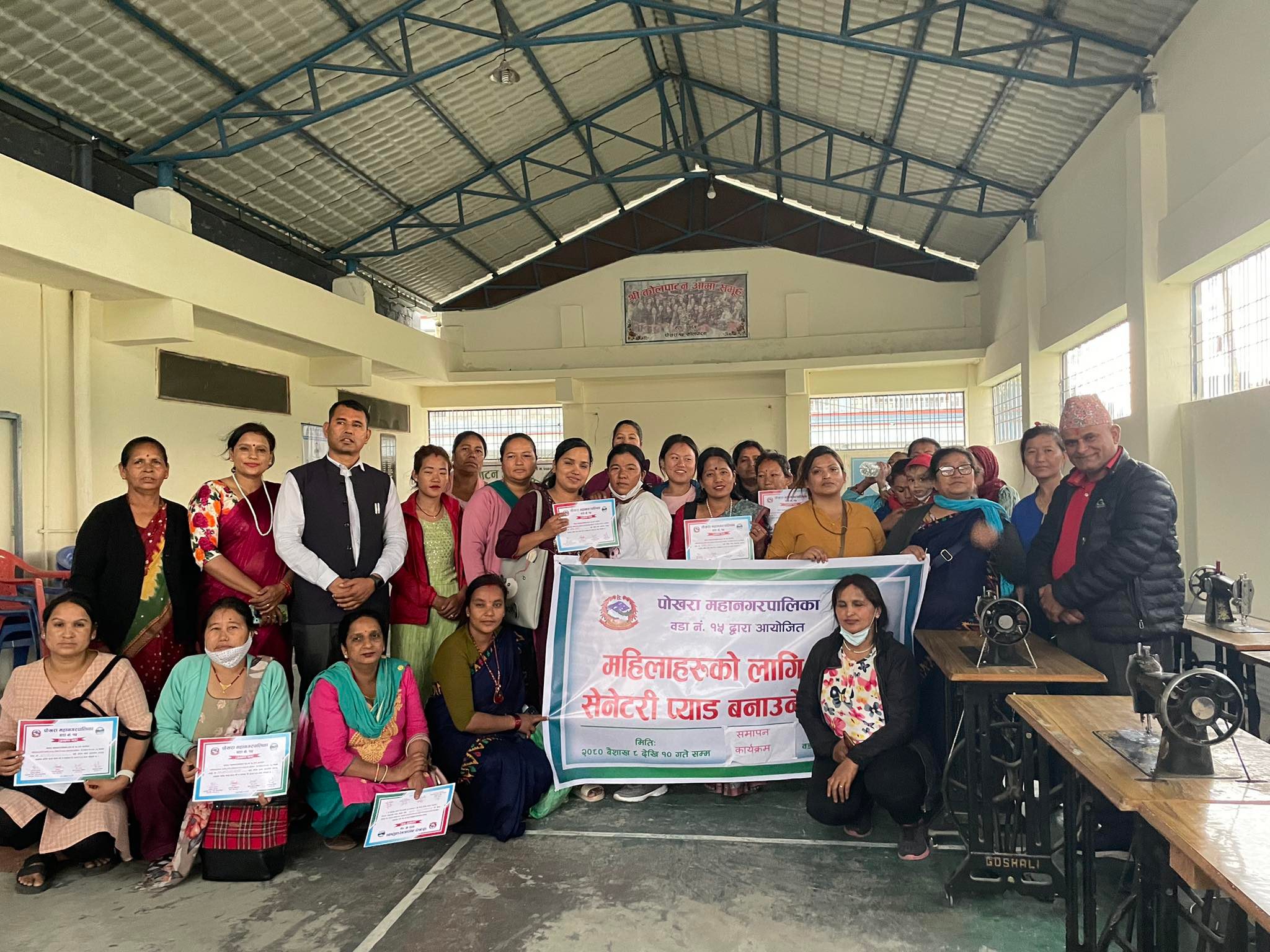 यसैबीच, पोखरा १५ द्वारा आयोजित महिलाका लागि घरेलु सेनिटरी प्याड बनाउने ३ दिने तालिम सकिएको छ । तालिमका सहभागीलाई वडाध्यक्ष बानियाँले प्रमाण–पत्र वितरण गरे । उनले महिलाको सशक्तीकरण, सीप विकास तथा क्षमता अभिवृद्धि गर्न यस्ता तालिम आयोजना गरिएको बताए ।