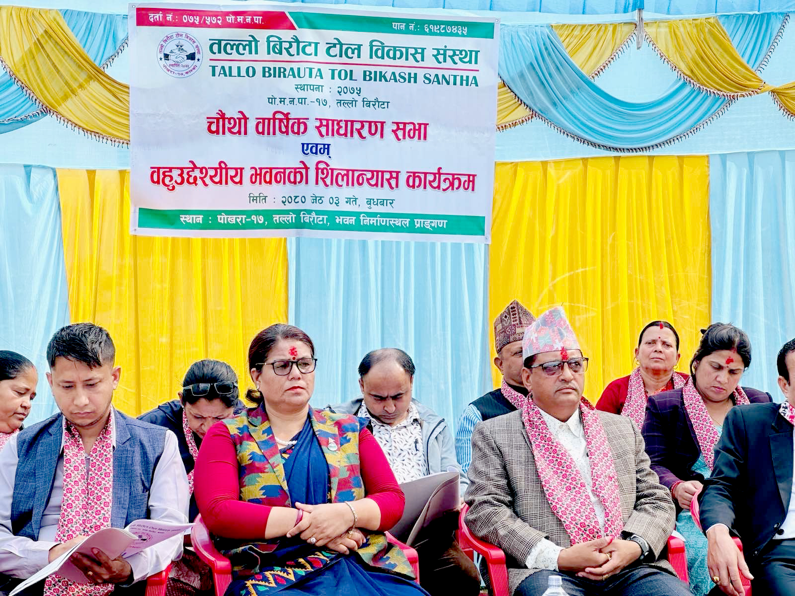 तल्लो बिरौटा टोल विकास संस्थालेको चौथो वार्षिक साधारण तथा बहुउद्देश्यीय सामुदायिक भवन शिलन्यास गरिएको छ ।
