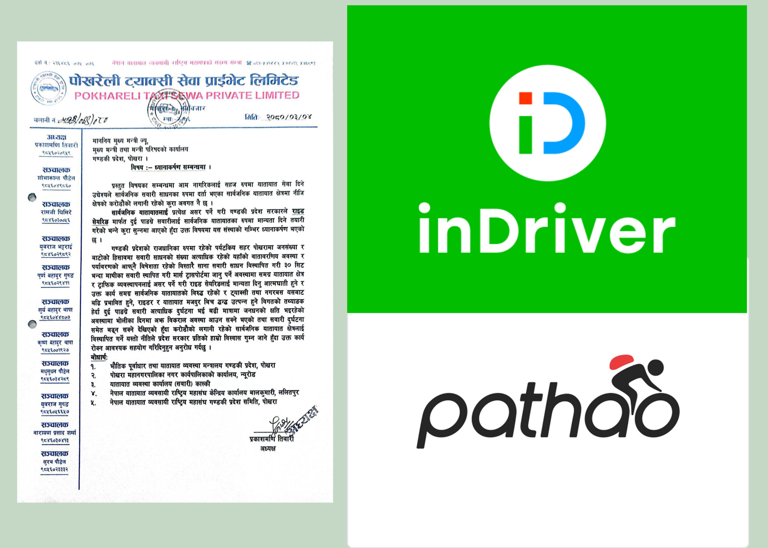 काठमाडौंमा पठाओ र टुटल लगायत राइड सेयरिङमार्फत निजी मोटरसाइकल, स्कुटर र कारले समेत यात्रु ओसारपसार गरिरहेका छन् । ती संस्था कम्पनी रजिस्ट्रारको कार्यालयमा दर्ता रहे पनि सार्वजनिक यातायात सेवा दिने कानुनी मान्यता भने अझै पाइसकेका छैनन् । पोखरामा पनि दर्ताबिना नै इन ड्राइभ एपमार्फत यात्रु खोजी मोटरसाइकल र स्कुटरले सेवा दिइरहेका छन् । यहाँका ट्याक्सी व्यवसायीले इनड्राइभको उक्त कार्यको विरोध जनाउँदै आएका छन् ।