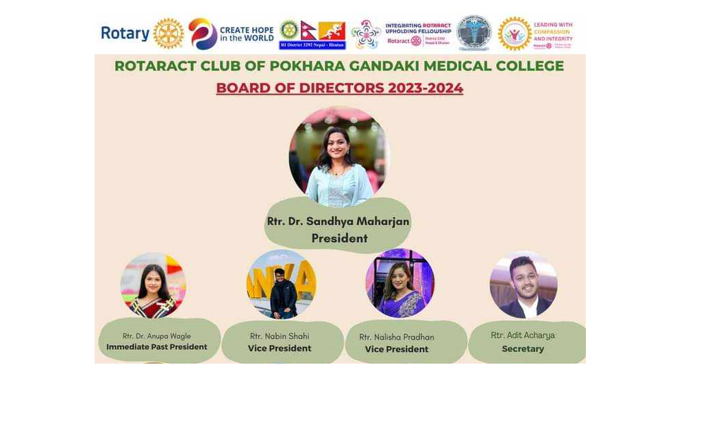 क्लबको बोर्ड अफ डाइरेकटर (बिओडी)को उपाध्यक्षद्वय नवीन साही र नलिसा प्रधान चयन भएका छन् । यस्तै क्लबको सचिव अदित आचार्य चयन भएका हुन् । संस्थाको, कोषध्यक्ष दीक्षान्त झा चयन भएका छन् । भने पूर्व अध्यक्ष अनुपा वाग्ले पदेन कार्यसमिति चयन भएकी हुन् ।
