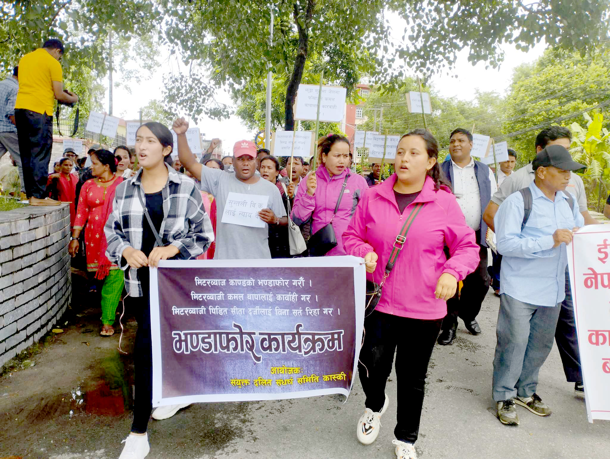 पोखरा महानगरपालिका २७ रिठ्ठेपानीकी सीता दर्जी चेक बाउन्सको मुद्दामा पक्राउ परेको विरोधमा पीडित पक्षले विरोध प्रदर्शन गरेका छन् । संयुक्त दलित संघर्ष समिति कास्कीको नेतृत्वमा सीताको परिवारसहितले जिल्ला प्रशासन कार्यालय कास्कीमा अगाडि मंगलबार नाराबाजी तथा धर्ना गरेका हुन् ।