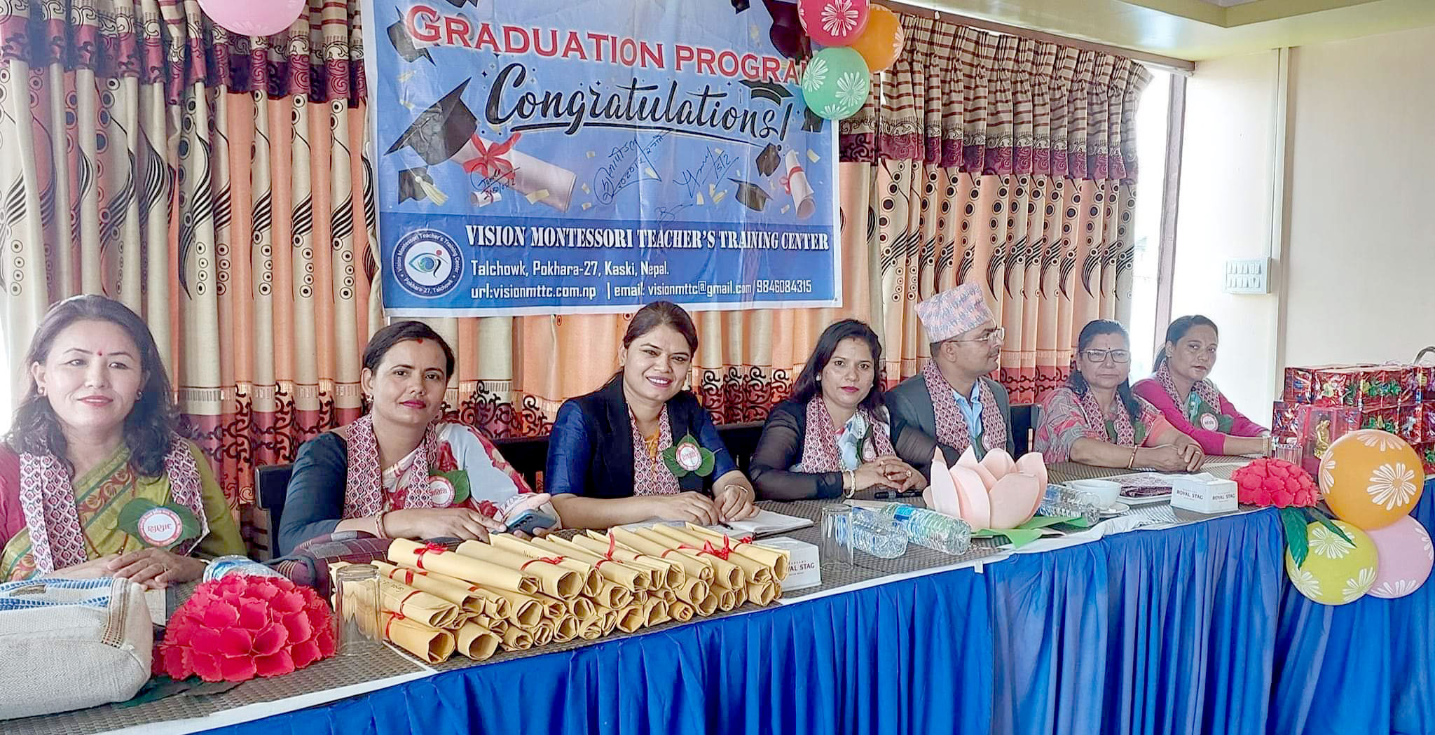 पोखरा महानगरपालिका–२७, तालचोकमा रहेको भिजन मन्टेसरी टिचर्स ट्रेनिङ सेन्टरबाट दीक्षित ४० जना प्रशिक्षकहरुलाई गत शनिबार प्रमाणपत्र वितरण गरिएको छ । ट्रेनिङ सेन्टरको छैटौं वार्षिकोत्सव तथा दीक्षान्त समारोहमा उक्त प्रशिक्षार्थीहरुलाई दीक्षित गरिएको हो ।