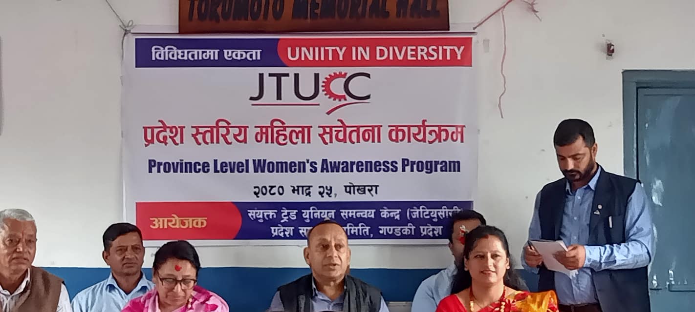 सयुक्त ट्रेड युनियन समन्वय केन्द्र (जेटियुसीसी) गण्डकी प्रदेश समन्वय समितिका संयोजक रुद्रबहादुर खत्रीले कामको संसारमा हुने हिंसा र दुव्र्यवहार रोक्नको लागि नेपालले महासन्धी अनुमोदन गर्नु पर्ने बताए । जेटियुसीसी गण्डकीले सोमबार आयोजना गरेको गण्डकी प्रदेश स्तरीय महिला सचेतना कार्यक्रममा संयोजक खत्रीले आम श्रमिकको लागि कार्यस्थलमा हुने हिंसा प्रमुख सवालको रुपमा आएको जानकारी दिए ।