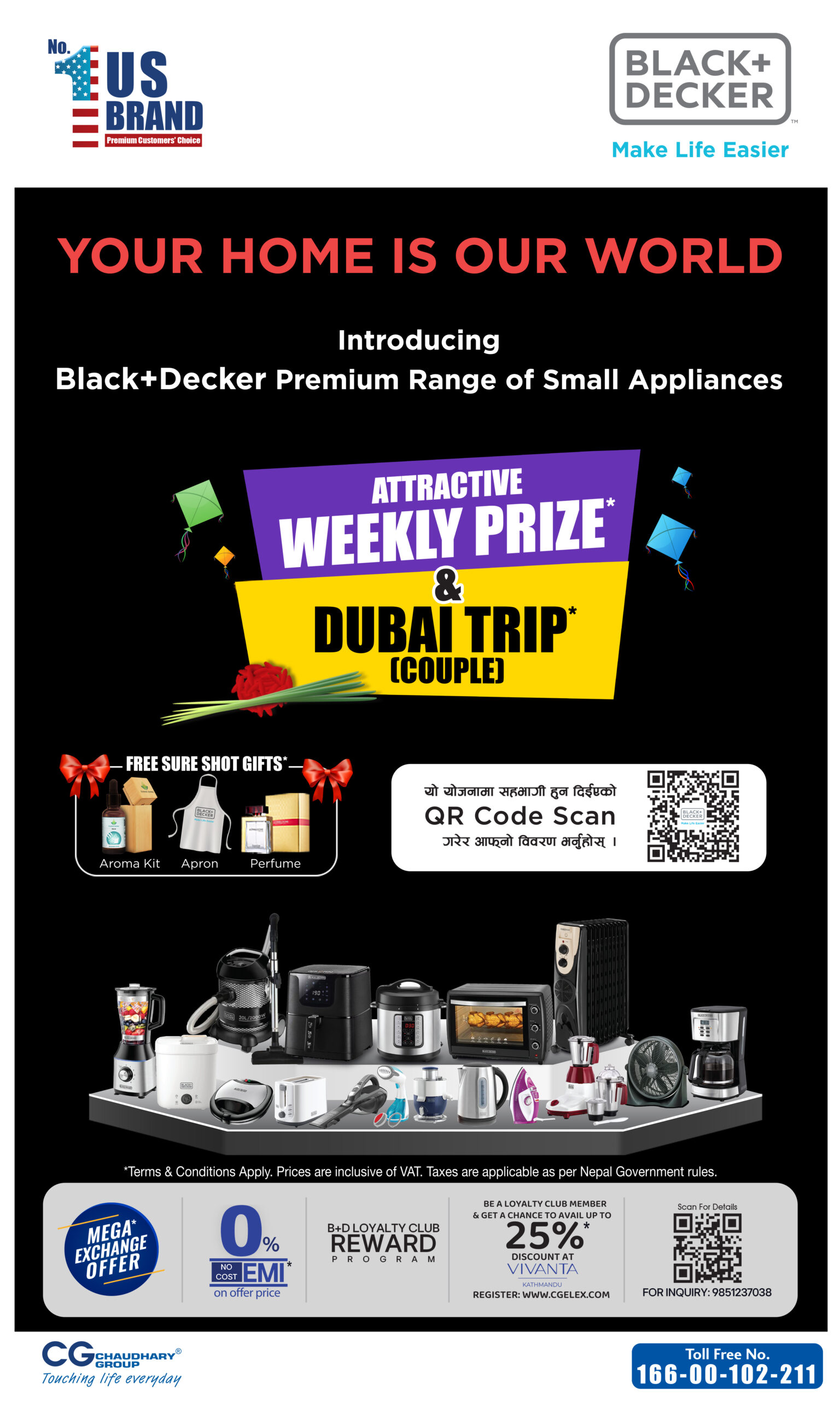 ब्ल्याक प्लस डेकरको कुनै पनि उपकरणको खरीद गरी हरेक साता एकजना भाग्यशाली विजेताले एउटा आकर्षक उपहार जित्न सक्ने कम्पनीले जनाएको छ । सम्पूर्ण अवधिमा ब्ल्याक प्लस डेकरको कुनै पनि उपकरण खरिद गर्ने ग्राहकमध्ये एकजनाले बम्पर उपहारको रूपमा एक जोडीका लागि दुबई भ्रमण गर्ने मौका दिइने भएको छ ।