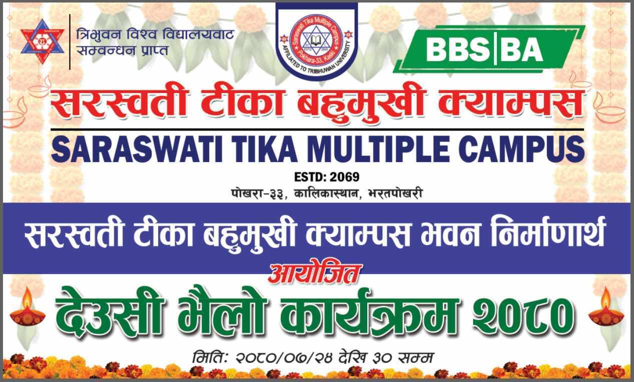 पोखरा महानगरपालिका वडा नं. ३३, कालिकास्थान, भरतपोखरीमा सञ्चालित सरस्वती टीका बहुमुखी क्याम्पसको भवन निर्माणार्थ यही कात्तिक २४ गतेदेखि ३० गतेसम्म देउसीभैलो गरिने भएको छ ।