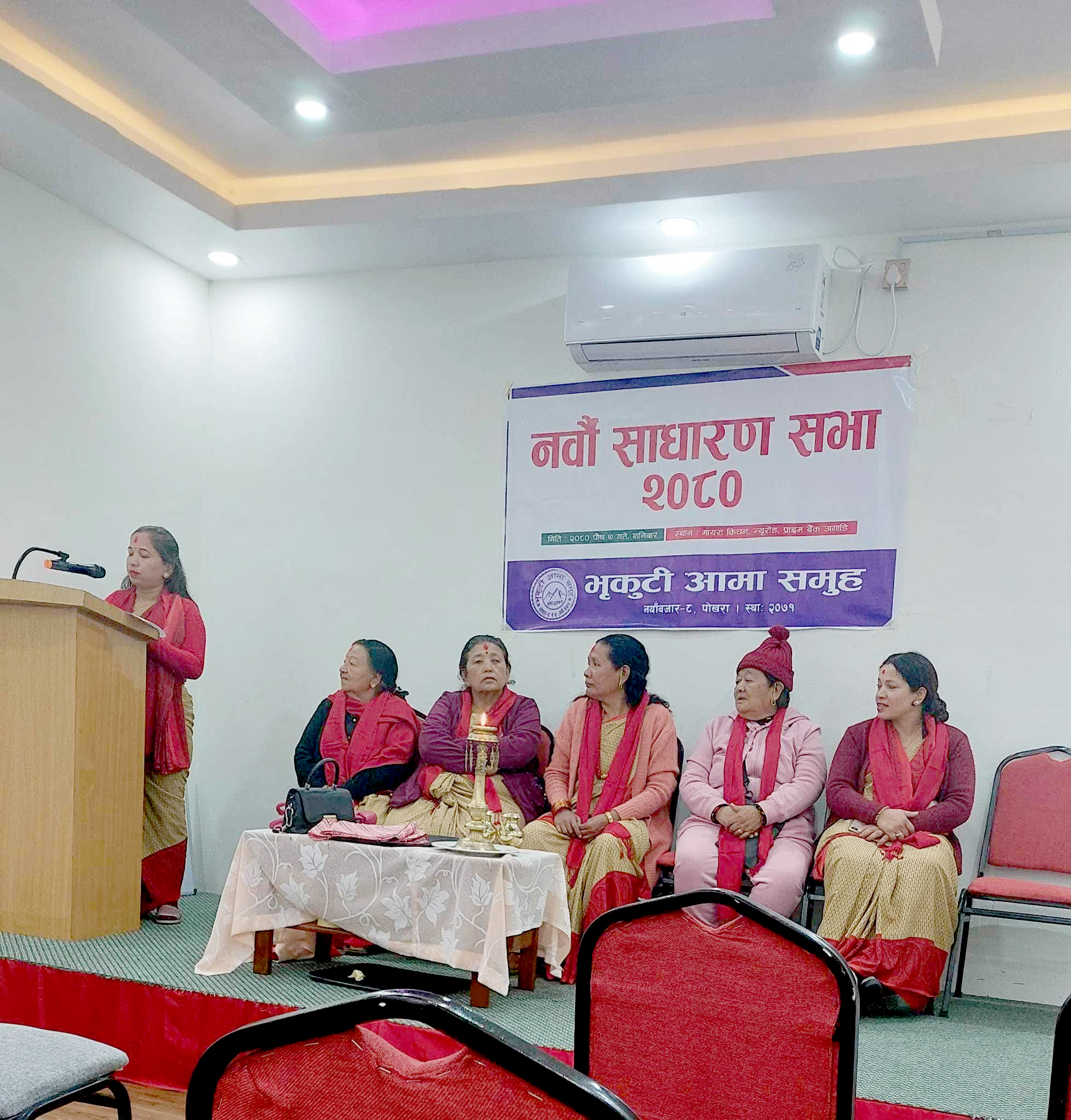पोखरा ८ नयाँबजारमा रहेको भृकुटी आमा समूहको नवाैं वार्षिक साधारण सभा शनिबार भएको छ । आमा समूहका संस्थापक अध्यक्ष नानुमाया पौडेलले साधारण सभाको उद्घाटन गर्दै समूहका सदस्यको एकता र सहकार्यले संस्थाको प्रगति हुने बताइन् । उनले सबैले एकापसमा समन्वय गर्न सके भावी दिनमा धेरै राम्रो काम हुने उल्लेख गरिन् ।