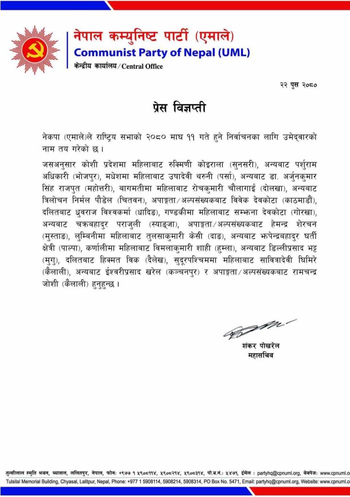एमालेले छान्यो राष्ट्रिय सभाका उम्मेदवार, गण्डकीबाट काे (सूचीसहित)