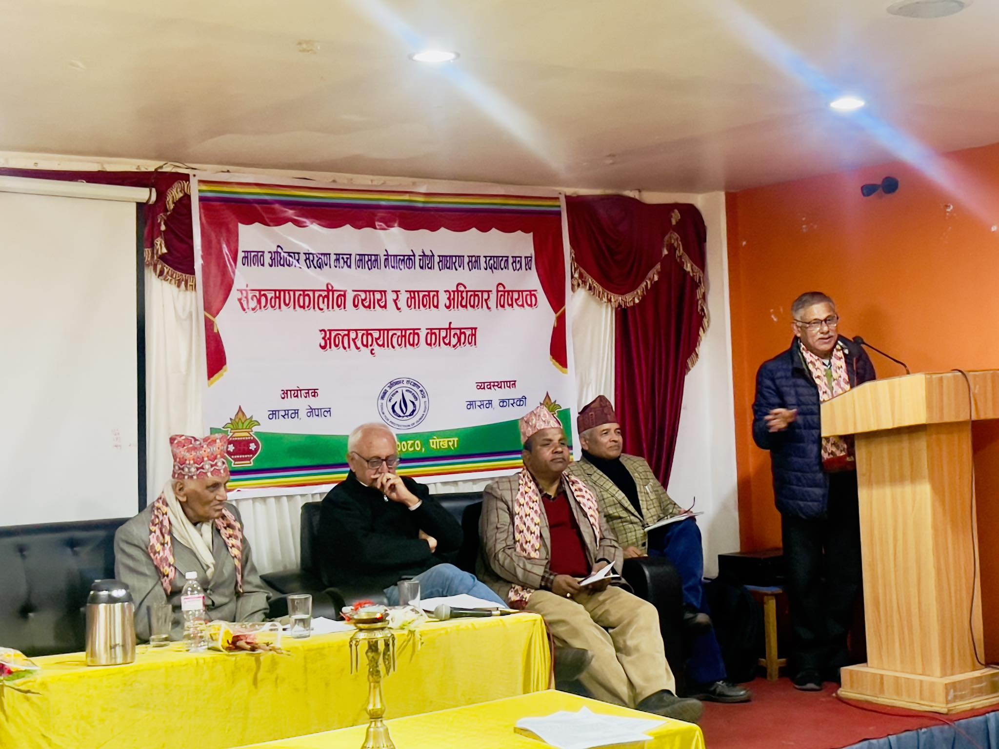 कार्यक्रमा मासम कास्कीका अध्यक्ष चक्रपाणि सुवेदी, शान्तिका लागि नागरिक समाजका पूर्व संयोजक विष्णुप्रसाद वराल, नेपाल रेडक्रस सोसाइटीका केन्द्रीय उपकोषाध्यक्ष डोलराज पाण्डे, सह–प्राध्यापक कालीदाश शर्मा, वरिष्ठ अधिवक्ता हरिप्रसाद शर्मा, अधिवक्ता कमलप्रसाद अर्याल, प्रेस काउन्सिल नेपालकी सदस्य एवं अधिवक्ता दुर्गा भण्डारी समेतले संक्रमणकालीन न्यायको सम्बन्धमा आफ्नो धारणा राखेका थिए ।