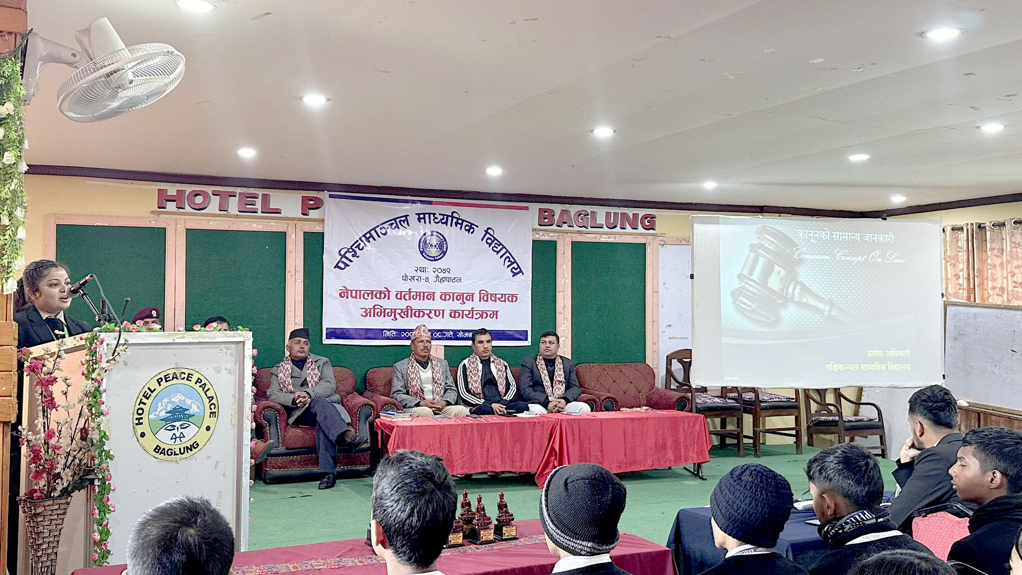 विद्यालयका प्रधानाध्यापक सरोज कोइरालाको अध्यक्षतामा भएको कार्यक्रमा शिक्षक विजयराज अधिकारी र श्रीकृष्ण गौतम, धौलागिरि बहुमुखी क्याम्पसका प्रमुख प्राडा रामप्रसाद उपाध्याय, प्रहरी नायब उपरीक्षक मदन केसी लगायतले बोलेका थिए ।