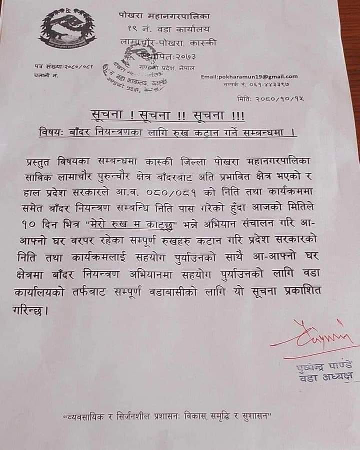 ‘आजको मितिले १० दिनभित्र मेरो रुख म काट्छु भन्ने अभियान संचालन गरी आफ्नो घर वरपर रहेका सम्पूर्ण रुखहरू कटान गरी प्रदेश सरकारको नीति तथा कार्यक्रमलाई सहयोग पुर्याउनको साथै आफ्नो घर क्षेत्रमा बाँदर नियन्त्रण अभियानमा सहयोग पुर्याउन वडाबासीलाई अनुरोध छ ।’ उनले भने ।