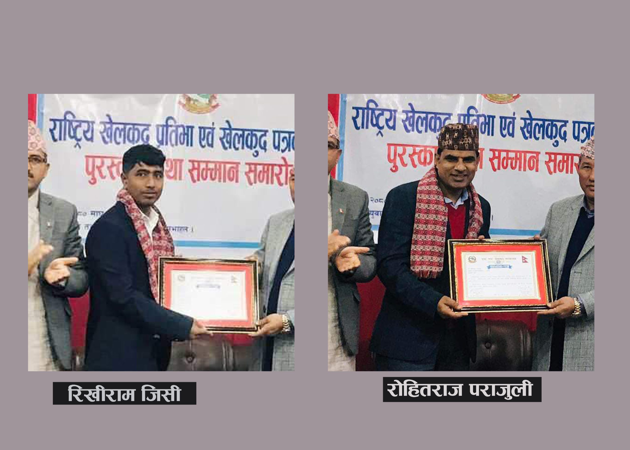 पत्रकारद्वय रोहितराज पराजुली र रिखिराम जिसी खेलकुद पत्रकारिताबाट सम्मानित भएका छन् । युवा तथा खेलकुद मन्त्रालयले बुधबार पराजुली र जिसीलाई पुरस्कार प्रदान गरेको हो । उनीहरुले जनही २५ हजार र प्रमाणपत्र प्राप्त गरेका छन् ।