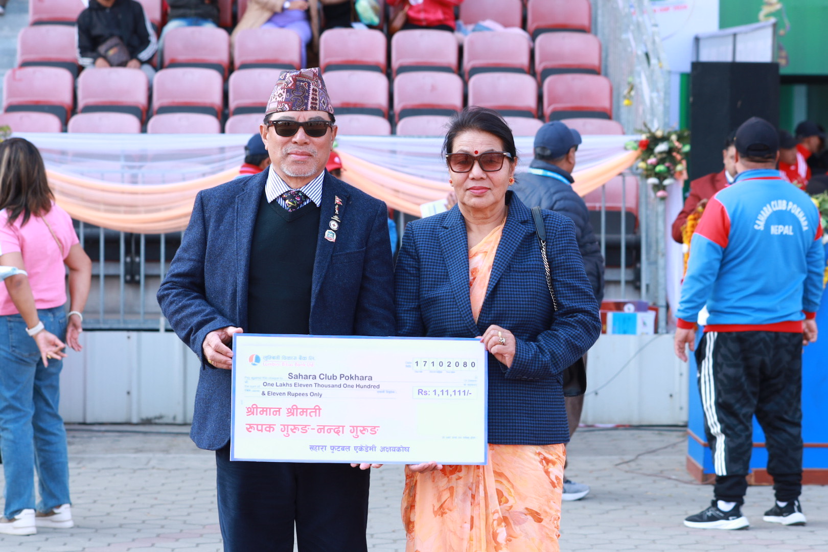 रुपक तथा नन्दा गुरुङले उक्त रकम बराबरको चेक क्लबका अध्यक्ष केशवराज बराललाई हस्तान्तरण गरेको महासचिव रामजी प्रसाद अधिकारीले बताए । क्लबले सञ्चालन गरेको सहारा एकेडेमीका बालकहरुको भरणपोषणमा थप टेवा पुग्ने विश्वासका साथ उक्त सहयोग गरेको पूर्व खेलाडी रुपकले बताए ।