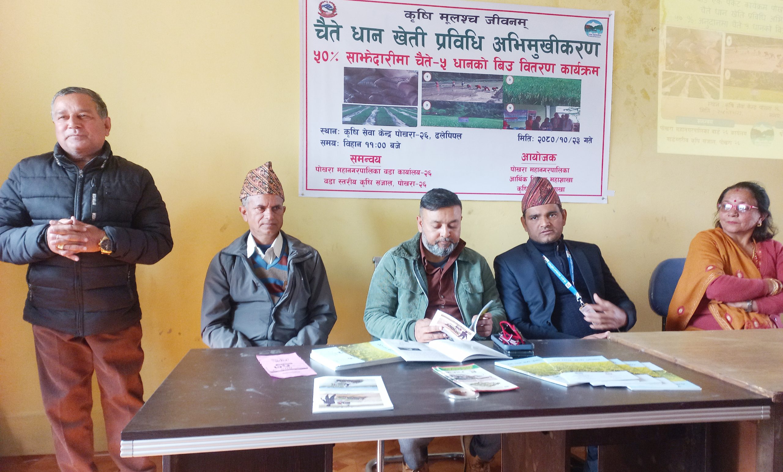 गत वर्ष १ हजार ६ सय केजी चैते धानको बिउ वितरण गरिएकोमा यो वर्ष करिब ३ हजार केजी बिउको माग आएकाले किसानमा चैते धान उत्पादनतर्फ आकर्षण देखिएको उनले सुनाए । वडा स्तरीय कृषि सञ्जाल पोखरा २६ का अध्यक्ष केशवराज ढुंगानाको अध्यक्षतामा भएको कार्यक्रममा वडा सदस्य लक्ष्मी भटराई, कृषि सेवा केन्द्र पोखरा २६ मा प्रमुख रामचन्द्र पौडेल, सञ्जालका सचिव ईश्वरराज भण्डारी, सदस्य विश्वप्रकाश बराल र कृषकको तर्फबाट सिला भण्डारीले बोलेका थिए ।
