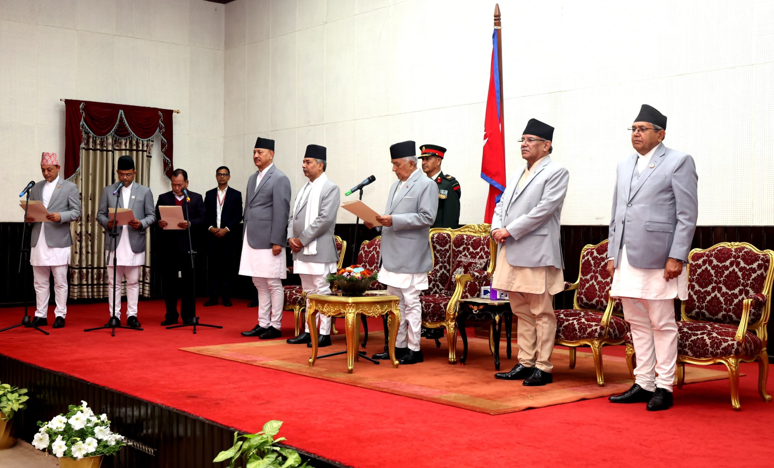 नवनियुक्त मन्त्रीहरूलाई सोमबार अपराह्न राष्ट्रपति रामचन्द्र पौडेलले शपथ गराएका हुन् । सपथ लिएका उनीहरुको मन्त्रालय तोकिएको छैन । उनीहरुले विनाविभागीय मन्त्रीका रुपमा सपथ लिएका हुन