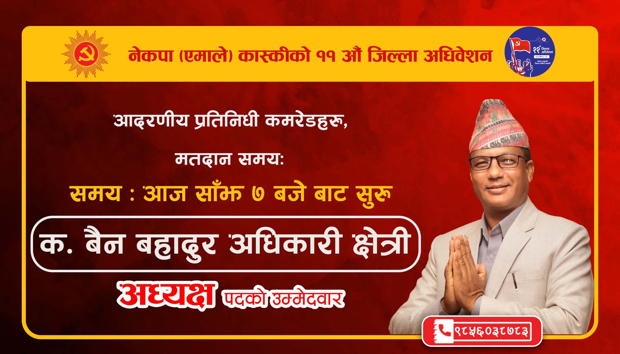 नेकपा एमाले कास्कीको ११ औं जिल्ला अधिवेशनबाट बैनबहादुर अधिकारी क्षेत्री विजयी भएका छन् । उनले निकटम् प्रतिस्पर्धी माधव बास्तोलालाई पराजित गर्दै जित हात पारेका हुन् । अधिकारीले ५५१ मत पाउँदा बास्तोलाले ३४७ मत ल्याएका थिए ।