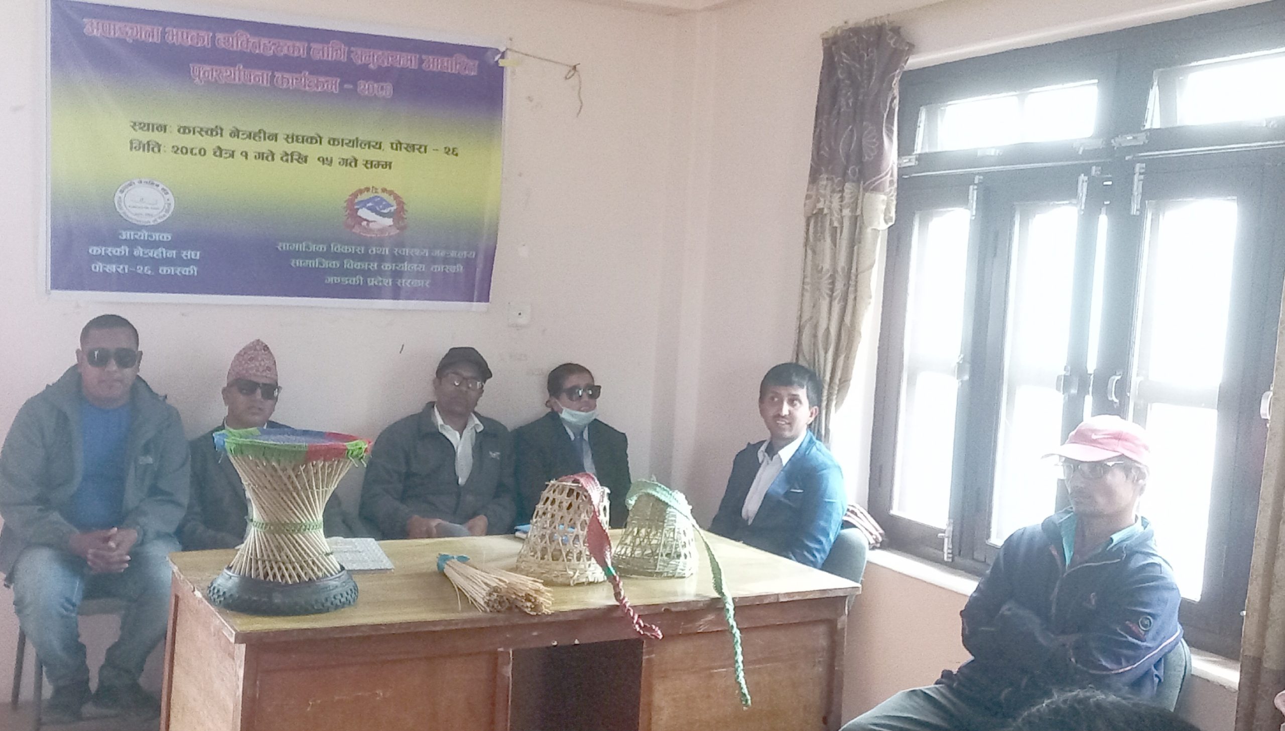 कास्की नेत्रहीन संघले अपांगता भएका व्यक्तिको जीवनयापनमा सहयोग पुग्ने गरी १५ दिने सिपमूलक तालिम प्रदान गरेको छ । सामाजिक विकास कार्यालय कास्कीको प्राविधिक सहयोग चैत १ गते देखि सञ्चालित तालिममा सहभागी ३२ जनालाई मुडा, कुचो, नाम्लो, सिंके झाडु र डोको बनाउने तालिम प्रदान गरिएको हो ।