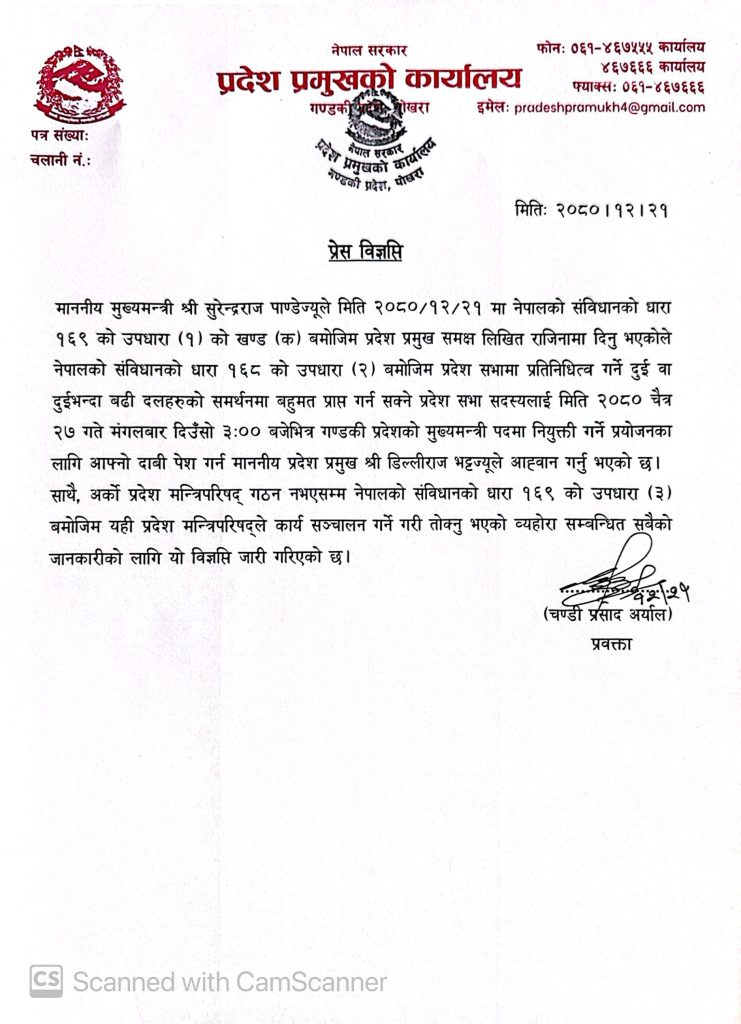 प्रदेश प्रमुखले नयाँ सरकार गठन गर्न संविधानको धारा १ सय ६८ को उपधार २ अनुसार आह्वान गरेका हुन् । भट्टले जारी गरेको विज्ञप्तिमा भनिएको छ, ‘संविधानको धारा १ सय ६८ को उपधारा २ अनुसार दुई वा दुई भन्दा बढी दलहरुको समर्थनमा बहुमत प्राप्त गर्न सक्ने प्रदेश सभा सदस्यलाई मिति २०८० चैत २७ गते मंगलबार दिउँसो ३ बजेभित्र गण्डकी प्रदेशको मुख्यमन्त्री पदमा नियुक्ति गर्ने दाबी पेश गर्न आह्वान गर्छु ।’