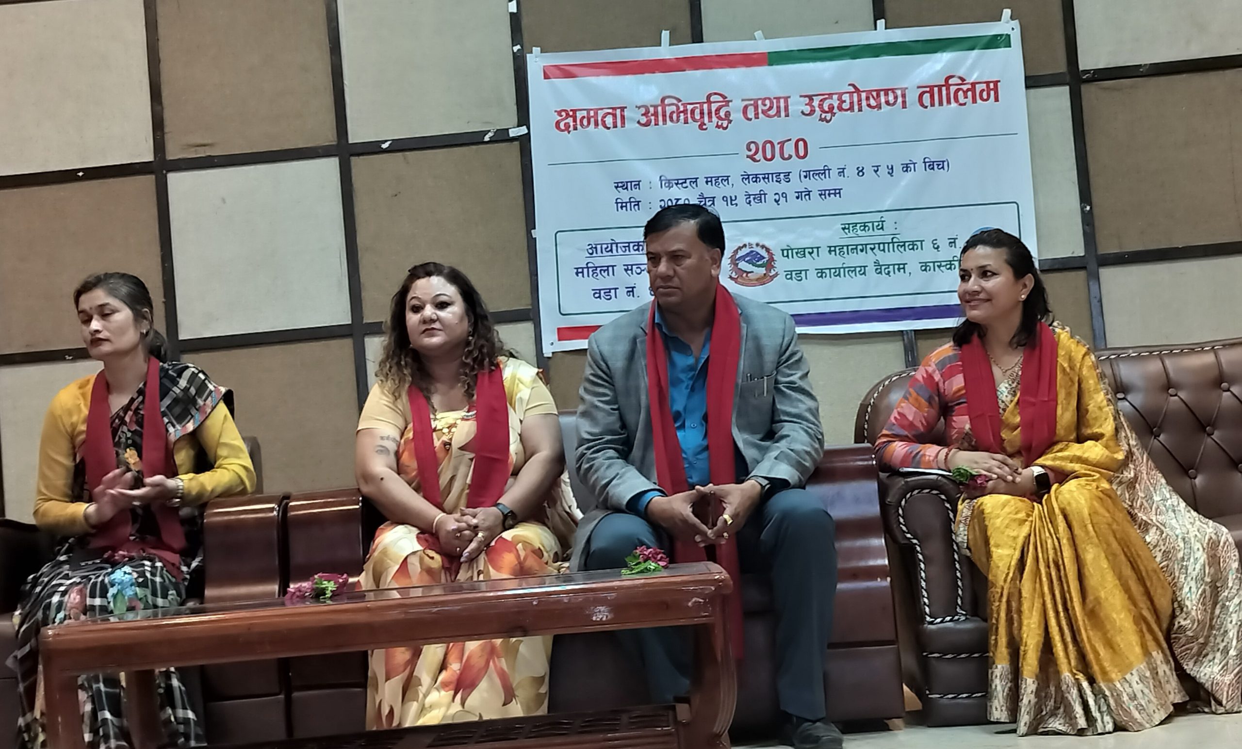 पोखरा महानगरपालिका वडा नम्बर ६ को महिला सञ्जालको आयोजनामा भएको क्षमता अभिवृद्धि तथा उद्घोषण तालिम बिहीबार सकिएको छ । पोखरा महानगरपालिका वडा नम्वर ६ को सहकार्यमा भएको तालिम समापन समारोहमा वडाध्यक्ष विष्णुबहादुर भट्टराईले वडाले महिला तथा युवा लक्षित कार्यक्रमलाई प्राथमिकतामा राखेर कार्ययोजना बनाएको बताए ।