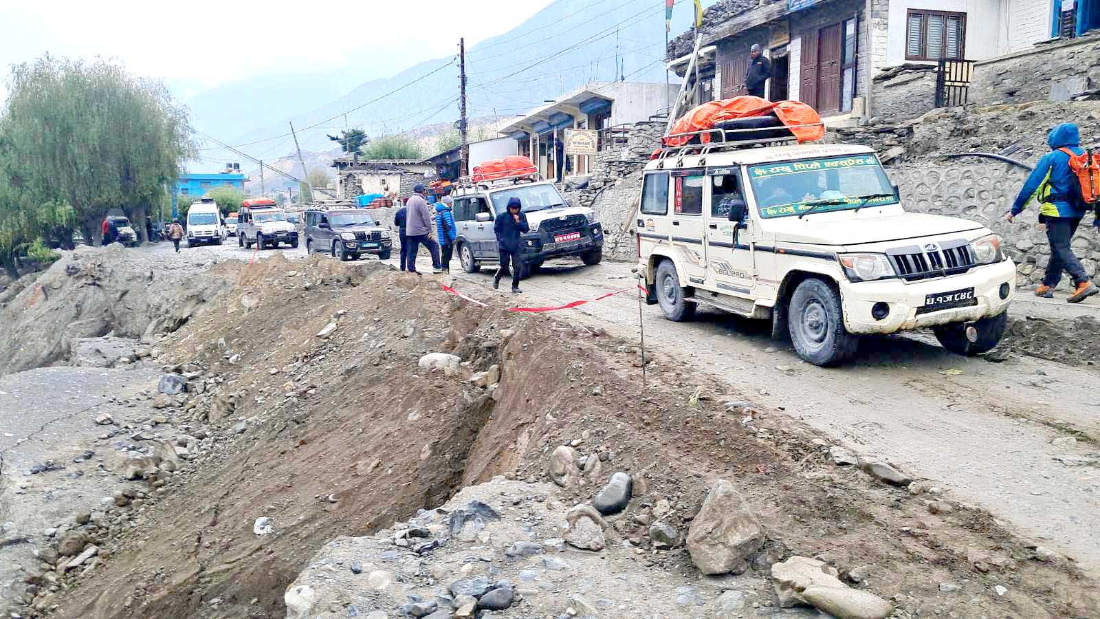 मुख्य राजमार्गमा करिब एक सय मिटर जमिन तल भास्सिदा जोमसोमबाट मुक्तिनाथ र उपल्लो मुस्ताङ जाने सयौं सवारी साधन अलपत्र परेका थिए । बेनी जोमसोम ७६ किमी सडकको चौथो खण्ड खन्तीदेखि जोमसोम पक्की पुलसम्मको घरपझोङ ४ जोमसोमको मुस्ताङ अस्पताल नजिक सडक यसअघि पनि भाँस्सिने गरेको थियो ।