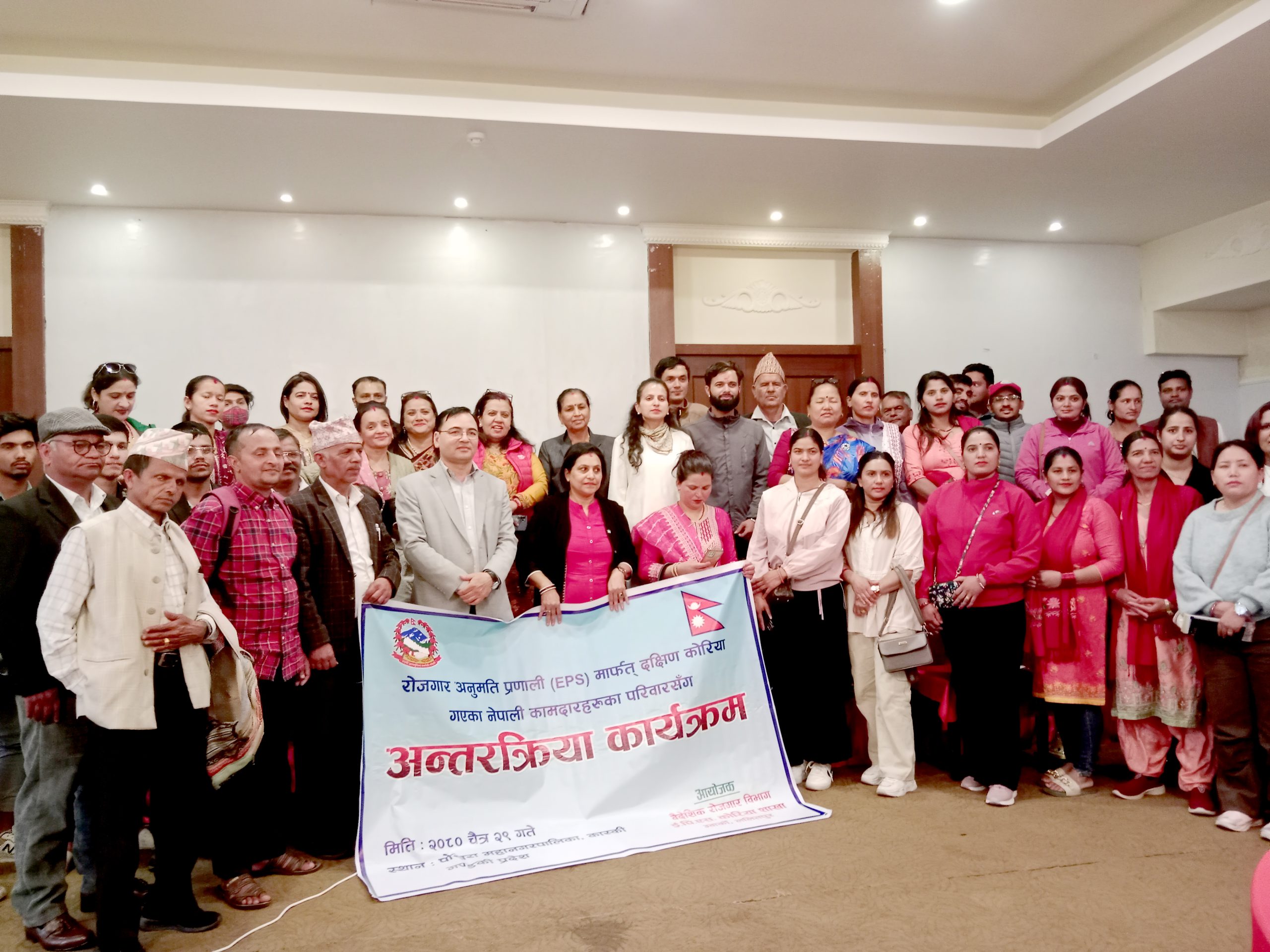 वैदेशिक रोजगार विभाग इपिएस कोरिया शाखाको आयोजनामा जनप्रतिनिधि, कर्मचारी, स्वास्थ्य स्वयंसेविका र कोरियामा रहेका व्यक्तिका परिवारसँग अन्तक्र्रिया कार्यक्रम बुधबार र बिहीबार पोखरामा सम्पन्न भएको छ ।