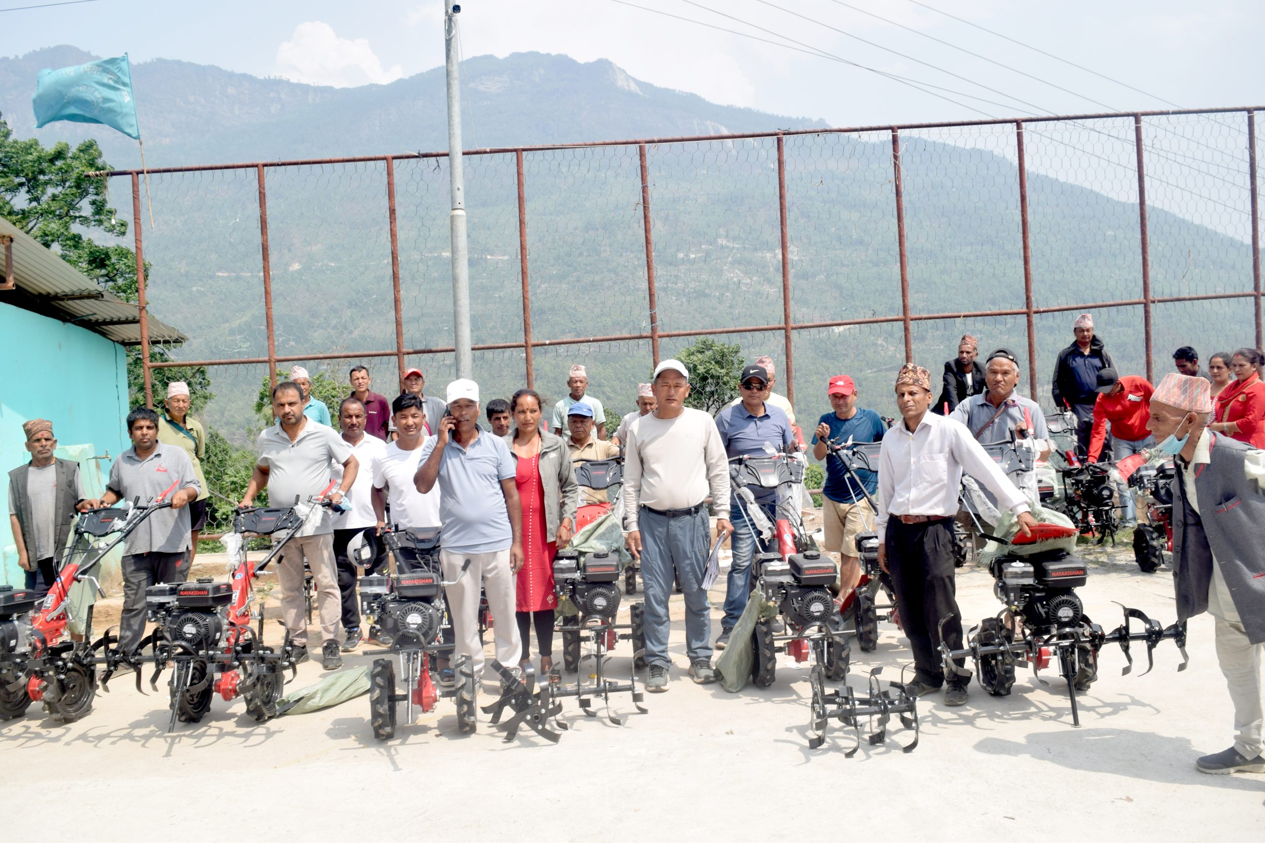 ‘४० हजार मूल्यका हाते ट्र्याक्टरमा कृषक र गाउँपालिकाले समान २० हजारको दरले साझेदारी भएको छ, छिट्टै व्यावसायिक रुपमा तरकारी खेती गर्ने कृषकलाई प्लाष्टिक टनेलसमेत अनुदानमा वितरण गर्ने योजना बनाएका छौं’, वडाध्यक्ष शाहीले भने । शुक्रबार वडा कार्यालयमा आयोजित कार्यक्रममा वडाध्यक्ष शाही, वडा सदस्य जितबहादुर खत्री, आइती दर्जीलगायतले कृषकलाई हाते ट्र्याक्टर वितरण गरे ।