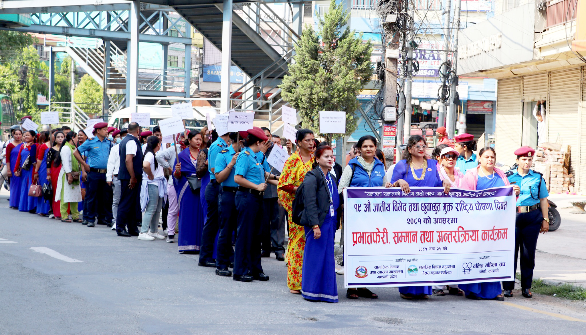 जातीय भेदभाव तथा छुवाछुत उन्मूलन राष्ट्रिय दिवसको सन्दर्भमा दलित महिला संघ (फेडो) कास्कीले जातीय छुवाछुत विरुद्ध सचेतनामूलक प्रभातफेरी ¥याली निकालेको छ ।