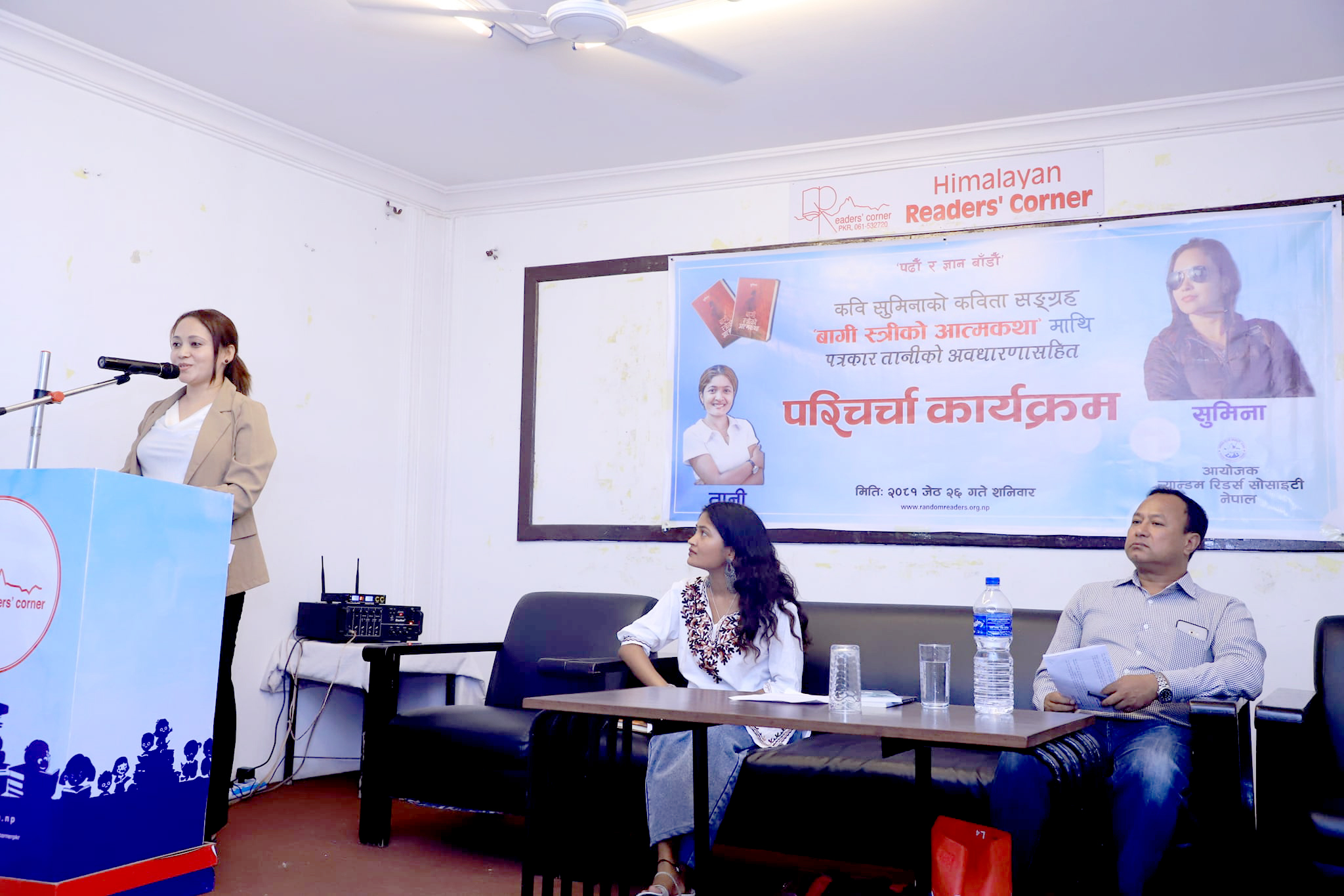 र्यान्डम रिडर्स सोसाइटीले शनिवार पोखरामा सुमिनाको कविता सङ्ग्रह ‘बागी स्त्रीको आत्मकथा’ कोे परिचर्चा गरेको छ । सोसाइटीका अध्यक्ष रुपिन्द्र प्रभावीको अध्यक्षतामा भएको कार्यक्रममा पत्रकार रीना थापा (तानी) ले कृतिमाथि अवधारणापत्र प्रस्तुत गरेकी थिइन् । उनले सुमिनाको कविताले पित्तृसत्तामाथि सशक्त प्रहार गर्दै आममहिलाको भावना समेटेको धारणा राखिन् ।