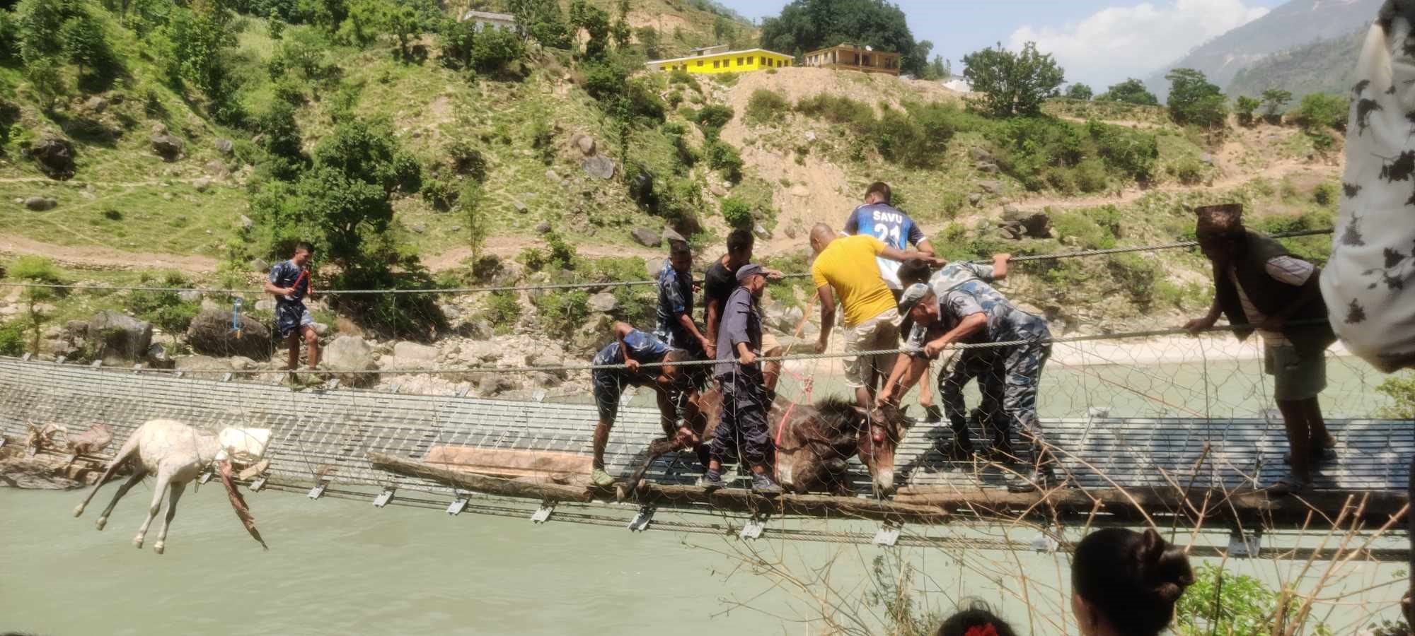 “पुलको जाली काटेर उद्धार गर्ने क्रममा दुई खच्चडको मृत्यु भएको हो”, उनले भने–“बाँकीको डुंगाको सहायताले जीवितै उद्धार गर्न सफल भयौँ ।”