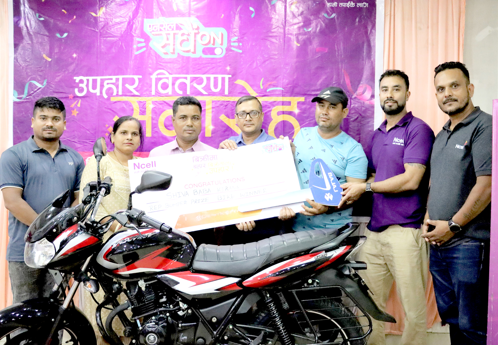 एनसेलले खुद्रा बिक्रेता र साना पसल गर्ने व्यवसायीलाई प्रोत्साहन तथा सहयोग गर्ने उद्देश्यले सञ्चालन गरेको ‘बिक्रीमा बहार, बिक्रेतालाई उपहार’ योजना अन्तर्गत झापाको झापा गाउँपालिका ५ पन्थपाडामा शिव बाबा किराना सञ्चालन गर्दै आएका नगेन्द्रप्रसाद गणेशले बजाज डिस्कभर बाइक जितेका छन् ।