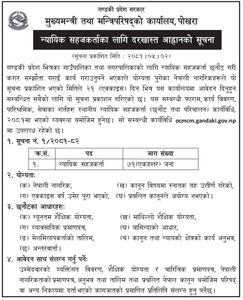 सूचनामा गण्डकी प्रदेश भित्रका गाउँपालिका तथा नगरपालिकाको लागि न्यायिक सहजकर्ता छनौट गरी करार सम्झौता गराई कार्य गराउन दरखास्त आह्वान गरिएको बताइएको छ । योग्यता पुगेका नेपाली नागरिकहरूले यो सूचना प्रकाशित भएको मितिले २१ दिन भित्र यस कार्यालयमा आवेदन दिन अनुरोध गरिएको छ।