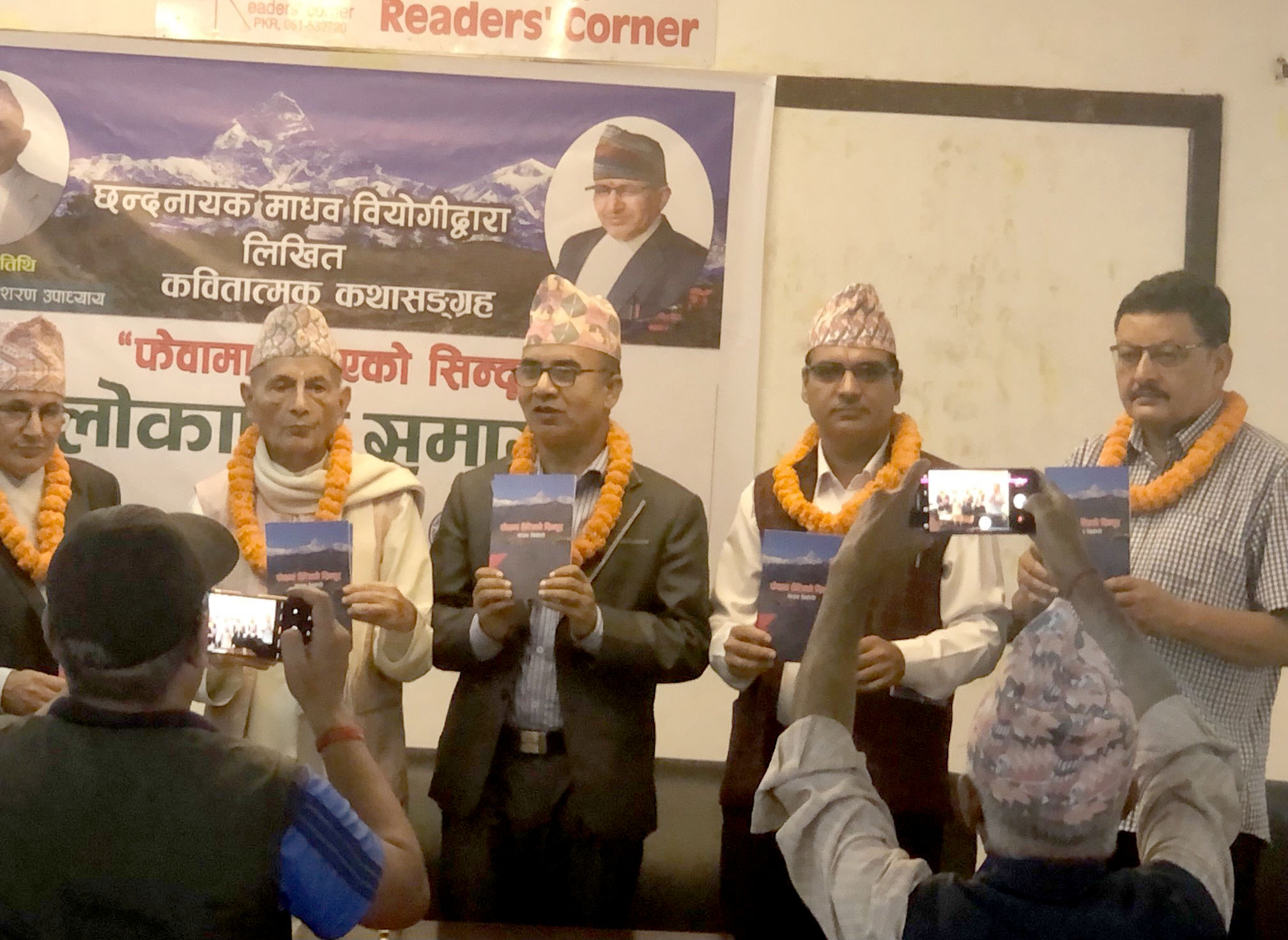 छन्दकवि माधव वियोगीद्वारा रचित फेवामा तैरिएको सिन्दूर नामक कवितात्मक कथासंग्रहको शनिबार पोखरामा लोकार्पण भयो । कविवर मुकुन्दशरण उपाध्यायले सो कृतिको लोकार्पण गर्दै छन्द बचाऊँ अभियान सञ्चालन गरी छन्दको पुनर्जागृतिमा विशिष्ट भूमिका खेल्ने वियोगीले छन्दलाई कथा लेखनमा समेत प्रयोग गरेर महत्वपूर्ण कार्य गरेको बताए । सो अवसरमा संस्कृतिविद् डा. कुसुमाकर न्यौपानेले ढुंगाढुंगा र पातपातमा छन्द बचाऊँ लेख्दै र प्रशिक्षण दिदैं सफलताको शिखरमा चढेका वियोगी लेखनमा नयाँ प्रयोग गर्न खप्पिस रहेको बताए ।