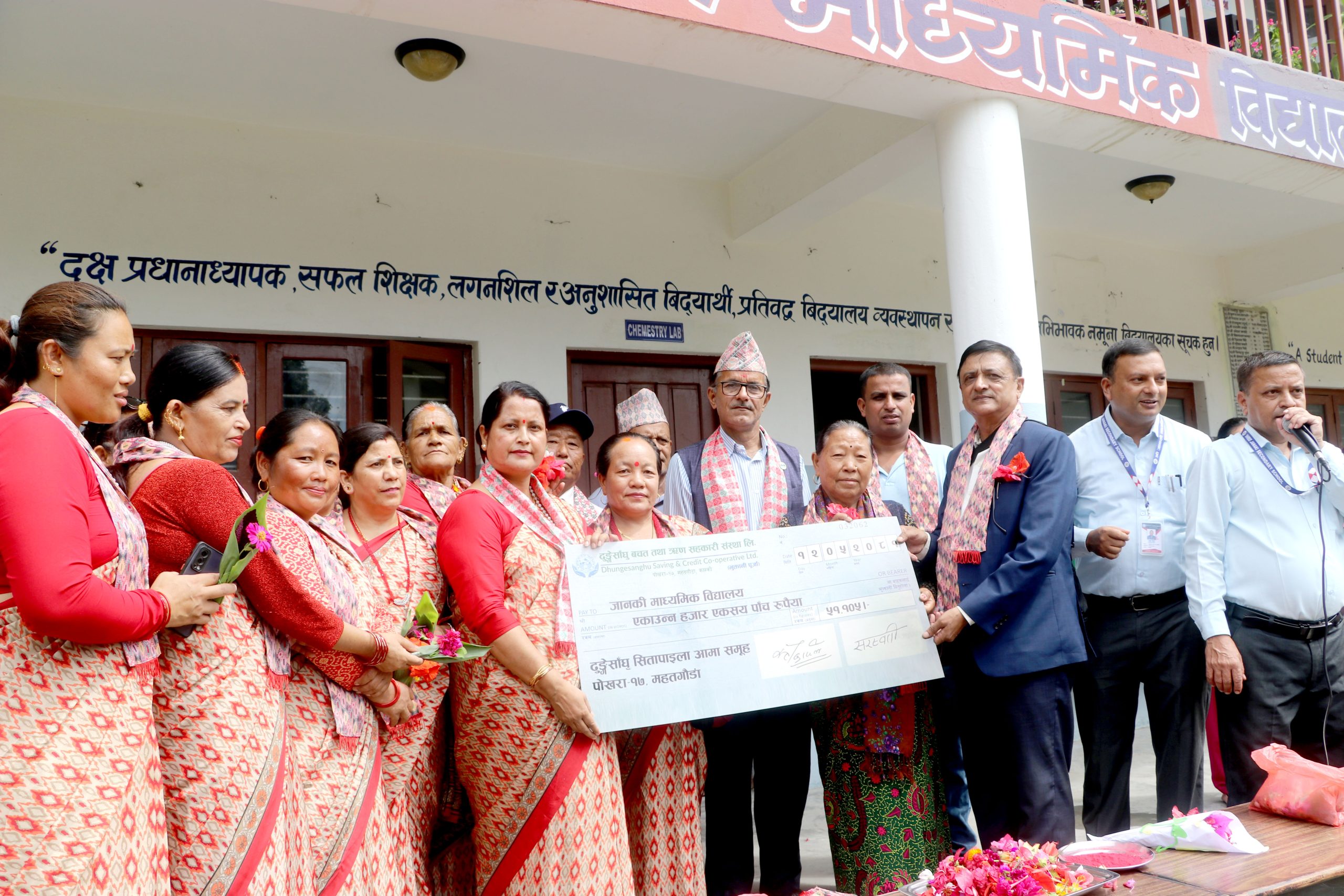 विद्यालयमा आयोजित एक कार्यक्रमका बिच उक्त रकम बरावरको चेक विद्यालय व्यवस्थापन समितिलाई हस्तान्तरण गरिएको थियो । सामूहिक रुपमा दर खाने रकम संकलन गरी विद्यालयमा अक्षयकोष स्थापना गरेको समूहकी अध्यक्ष सीता काप्mलेले जानकारी दिइन् । ‘समाजका विपन्न एवं असहायको शिक्षाको अध्ययन थलो बनेको सामुदायिक विद्यालयको शैक्षिक गुणस्तरमा सहयोग पुग्ने विश्वास समुहले लिएको छ,’ उनले भनिन्, आवश्यकता अनुसार समुहले सहयोगलाई निरन्तरता दिने छ ।’