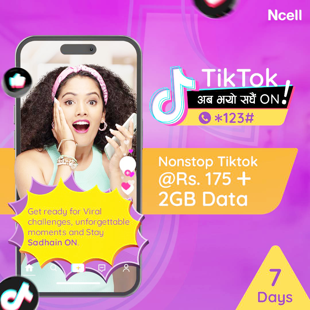 एनसेलका चिफ कमर्सियल अफिसर उमेर मोहसिनले शुक्रबारबाटै लागू हुने गरी सुलभ दरमा टिकटकमा पहुँच दिने टिकटक प्याक ल्याएको जनाए । एनसेलले सधैं अन योजना अन्तर्गत बेसिक, बेस्ट र अनलिमिटेड गरी ३ प्रकारका प्याक प्रदान गर्दै आएको छ । बेसिकमा सात दिन समयसीमा रहेको सधै अन प्याकमा ग्राहकले अन्य बन्डल सेवाहरु बाहेका १ जिबी निःशुल्क सोसल मिडिया प्याक पाउँदै आएका छन् ।