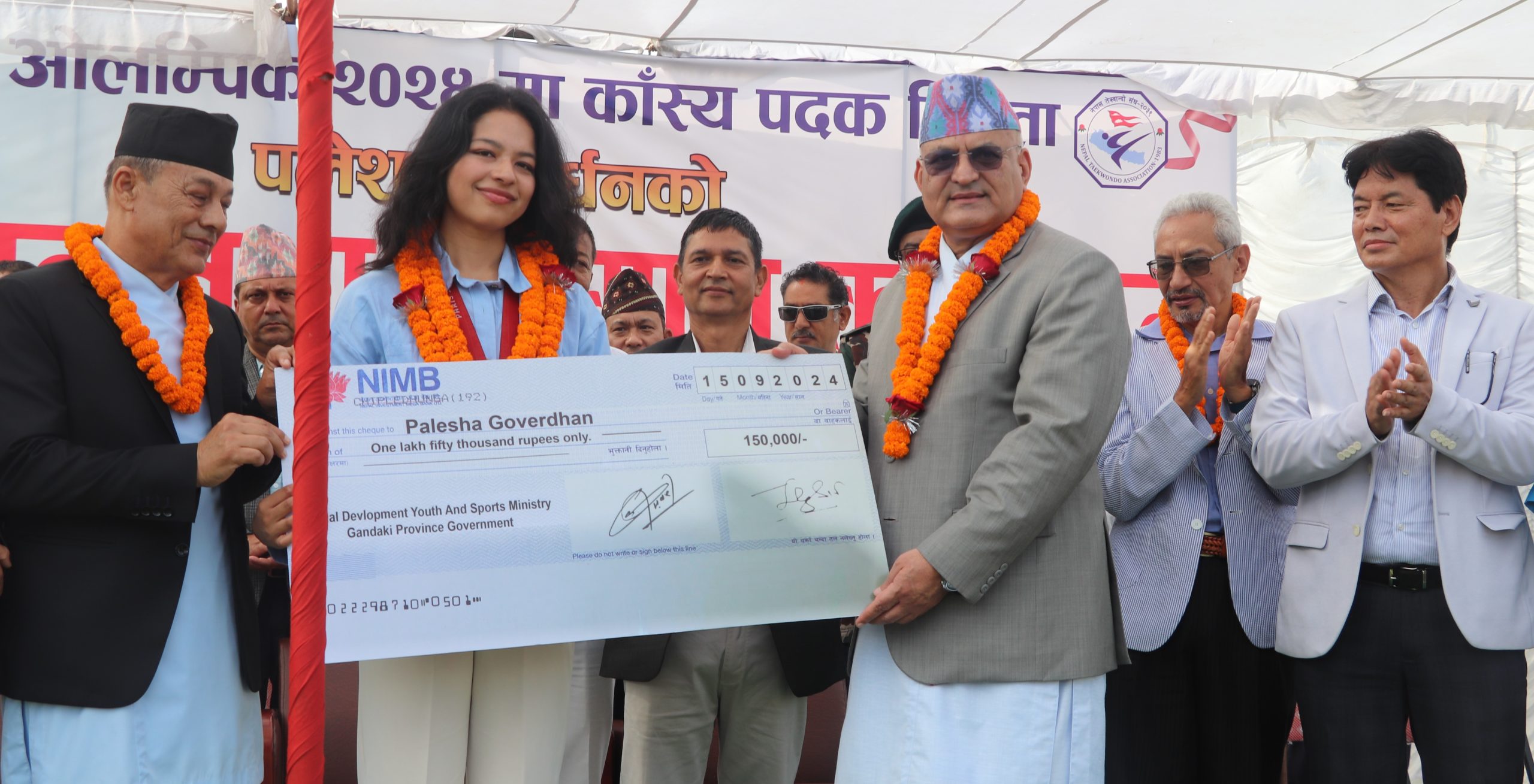 पारा ओलम्पिक २०२४ मा नेपाललाई ऐतिहासिक पदक दिलाएकी तेक्वान्दो खेलाडी पलेसा गोवर्धनलाई आज पोखरामा नगदसहित सम्मान गरिएको छ ।